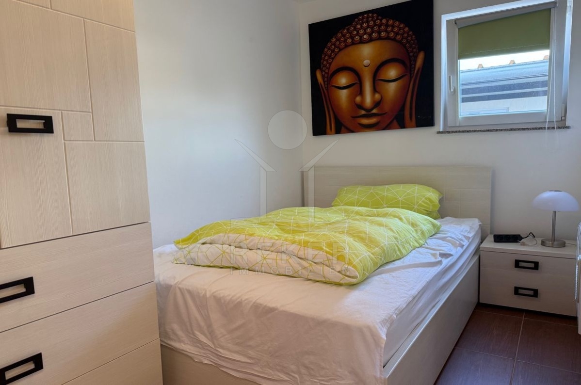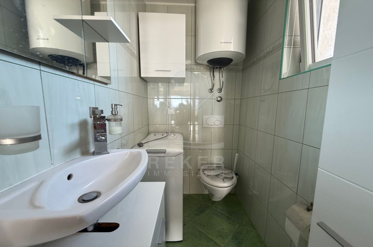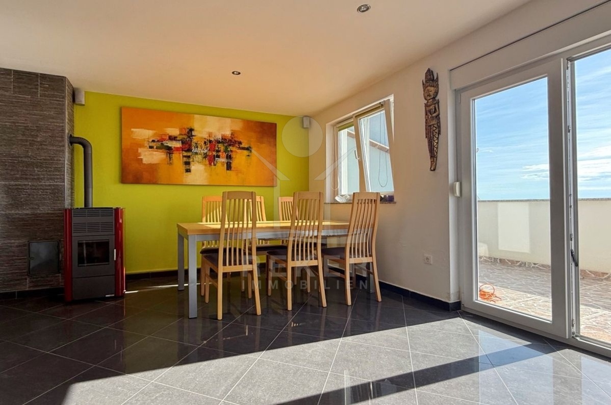 Die Wohnfläche von 72 m² verteilt sich auf zwei Ebenen. Im ersten Stock erwarten Sie ein helles Wohnzimmer mit Essbereich, eine ausgestattete Küche, ein möbliertes Schlafzimmer und ein Badezimmer mit Waschmaschine. Vom Wohnzimmer geht es direkt hinaus auf den Balkon, der den Wohnraum erweitert. Eine Holztreppe führt ins 22 m² große Dachgeschoss, das derzeit als Stauraum dient. Dort besteht die Möglichkeit, zwei zusätzliche Schlafzimmer und ein weiteres Bad einzurichten. Zur Ausstattung zählen PVC-Fenster, Klimaanlage und ein Pelletofen für effizientes Heizen. Die Wohnung wird möbliert verkauft und ist sofort bezugsbereit.