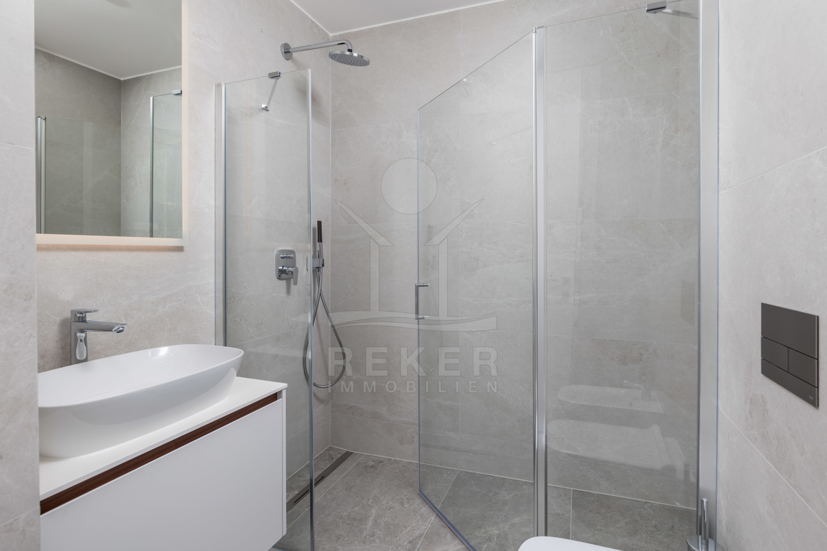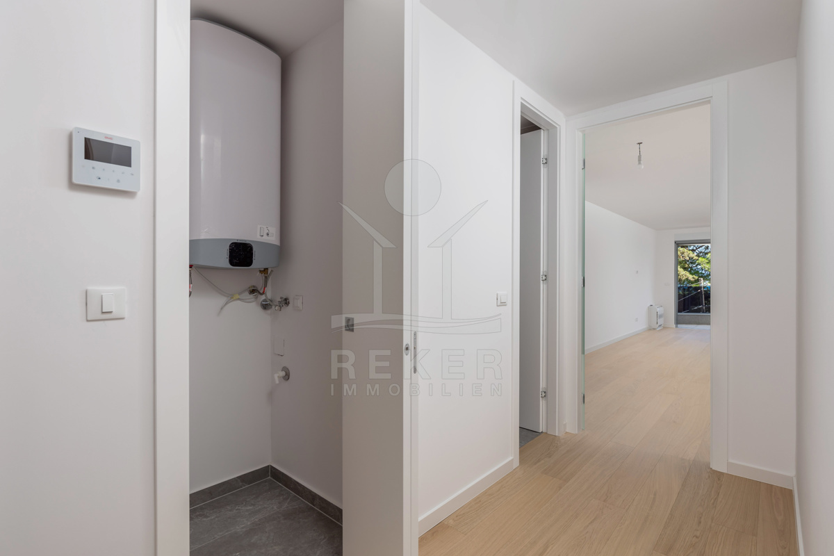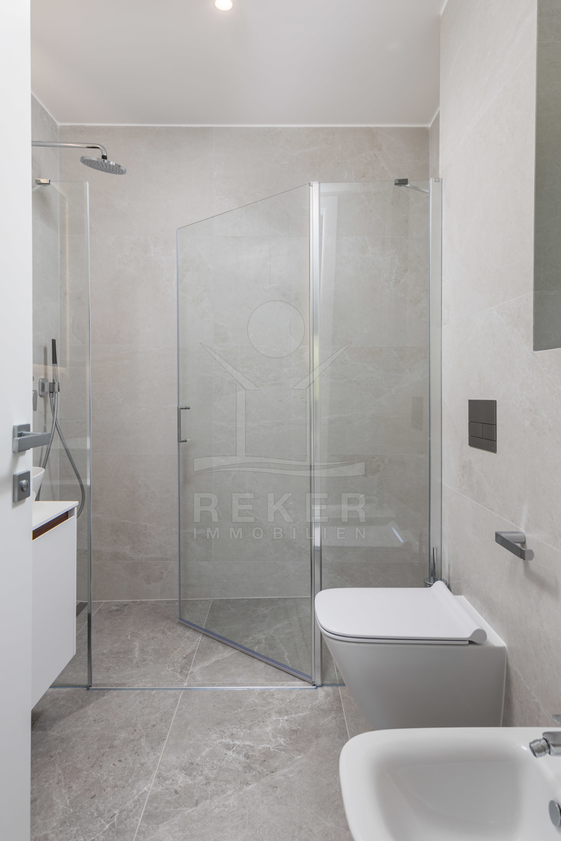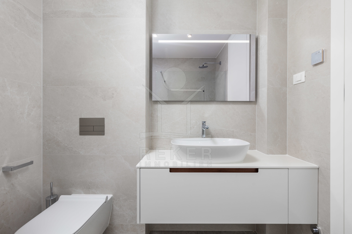 Hochwertige Materialien und moderne Technik … Elektrische Jalousien, Aluminiumfenster, Fußbodenheizung mit Fan-Coil-System, hochwertige Bäder und eine einbruchsichere Eingangstür gehören zur Standardausstattung. Zwei Tiefgaragenplätze, ein Außenstellplatz und zwei praktische Abstellräume sind ebenfalls dabei.