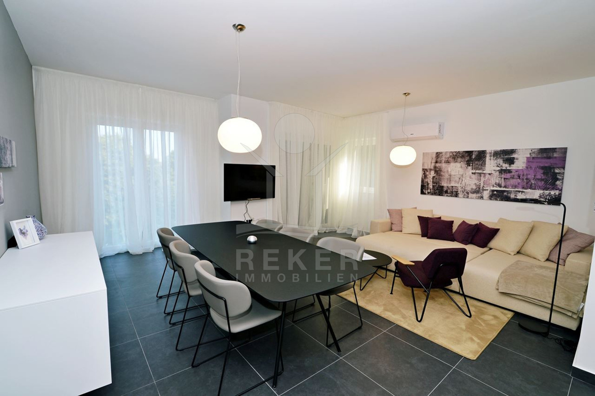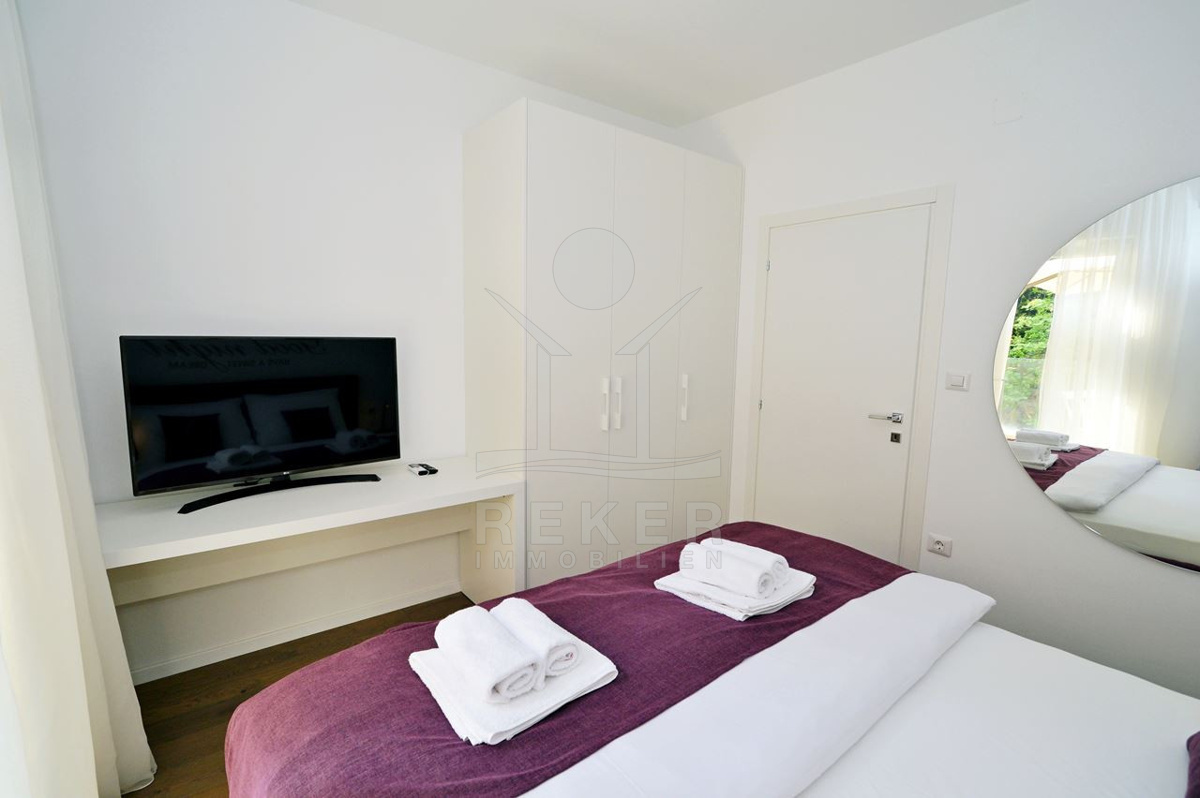 Nur ein paar Kilometer von Opatija entfernt liegt diese moderne Villa … direkt an der Küste, nur 50 Meter vom Meer. Dank ihrer Lage am Hang haben Sie freien Blick auf die Adria, ganz ohne störende Bebauung davor. Und weil rundherum dichter Baumbestand ist und der nächste Nachbar etwa 100 Meter entfernt wohnt, bleibt es ruhig. Richtig ruhig. Klingt das nach Rückzug? Ist es auch.