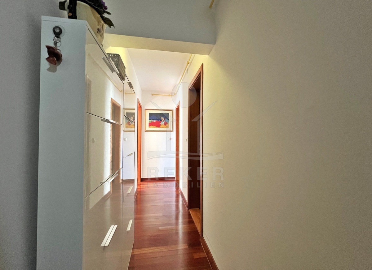 Die Wohnung liegt im zweiten Stock und bietet 74,70 m² Wohnfläche. Zwei Balkone erweitern den Lebensraum. Vom Wohnzimmer aus gelangen Sie direkt auf den Südbalkon mit weitem Blick über die Kvarner-Bucht. Beide Schlafzimmer öffnen sich auf den Nordbalkon, angenehm kühl an heißen Tagen.