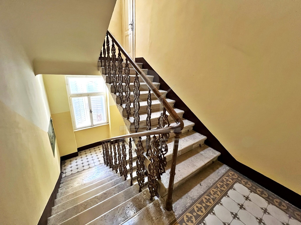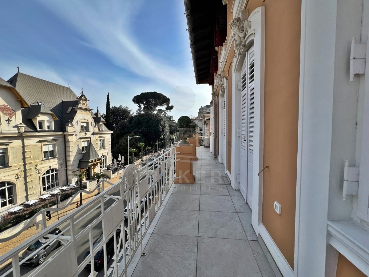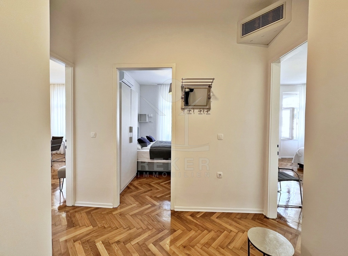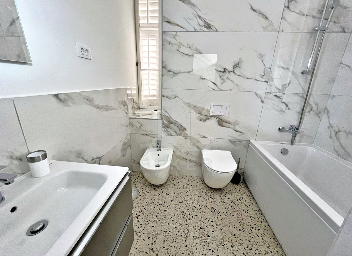Mitten im Zentrum von Opatija – in einer renovierten Villa mit Geschichte. Die Wohnung liegt im dritten Stock eines charmanten, österreichisch-ungarischen Gebäudes mit insgesamt fünf Etagen. Die Fassade: historisch. Das Innenleben: modernisiert. Der Eingang erfolgt über das gepflegte Treppenhaus. Parkplätze sind nicht direkt zugeordnet. Dafür alles fußläufig: Meer, Stadt, Ruhe inklusive. Der Balkon zieht sich über die gesamte Länge der Wohnung. Von hier aus fällt der Blick aufs Meer – nicht frontal, aber sichtbar. Die Villa selbst steht erhöht und ist rundum bebaut.