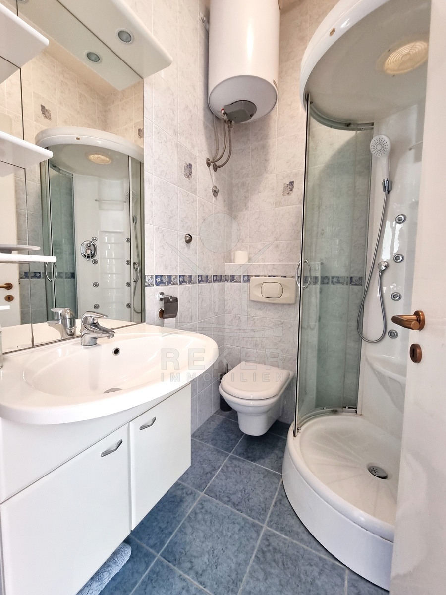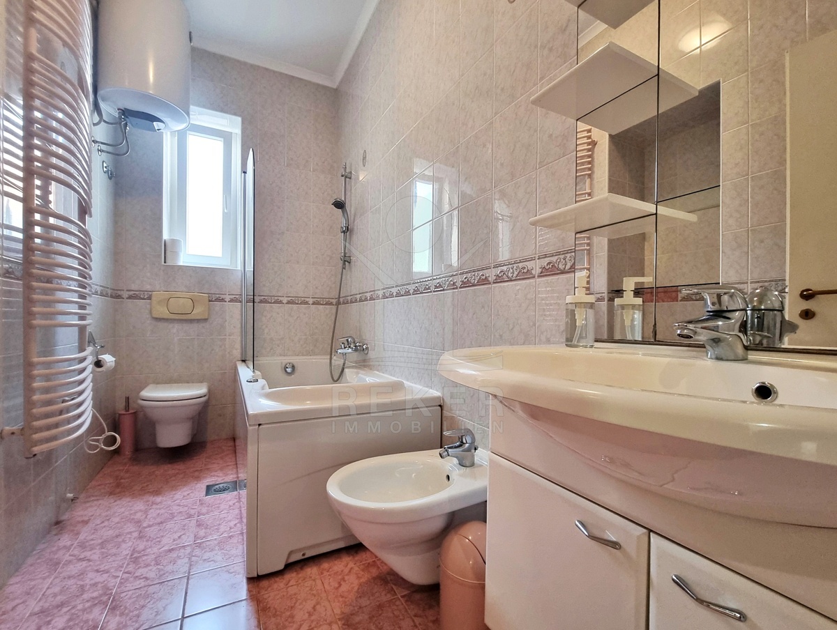 Auf etwa 99 m² bietet die Wohnung großzügigen Platz. Mittelpunkt ist das helle Wohnzimmer mit Essbereich und Zugang zum großen Westbalkon. Hier lässt sich der Sommer wunderbar genießen. Die moderne Küche ist separat angelegt und führt auf einen zweiten Balkon mit Südausrichtung. Von dort sehen Sie auf das Zentrum von Opatija und teilweise auf das Meer. Zwei Schlafzimmer und zwei Badezimmer mit Fenster, Badewanne und Bidet schaffen Raum für Komfort und Privatsphäre. Alles ist hochwertig ausgestattet, geschmackvoll eingerichtet und angenehm hell.