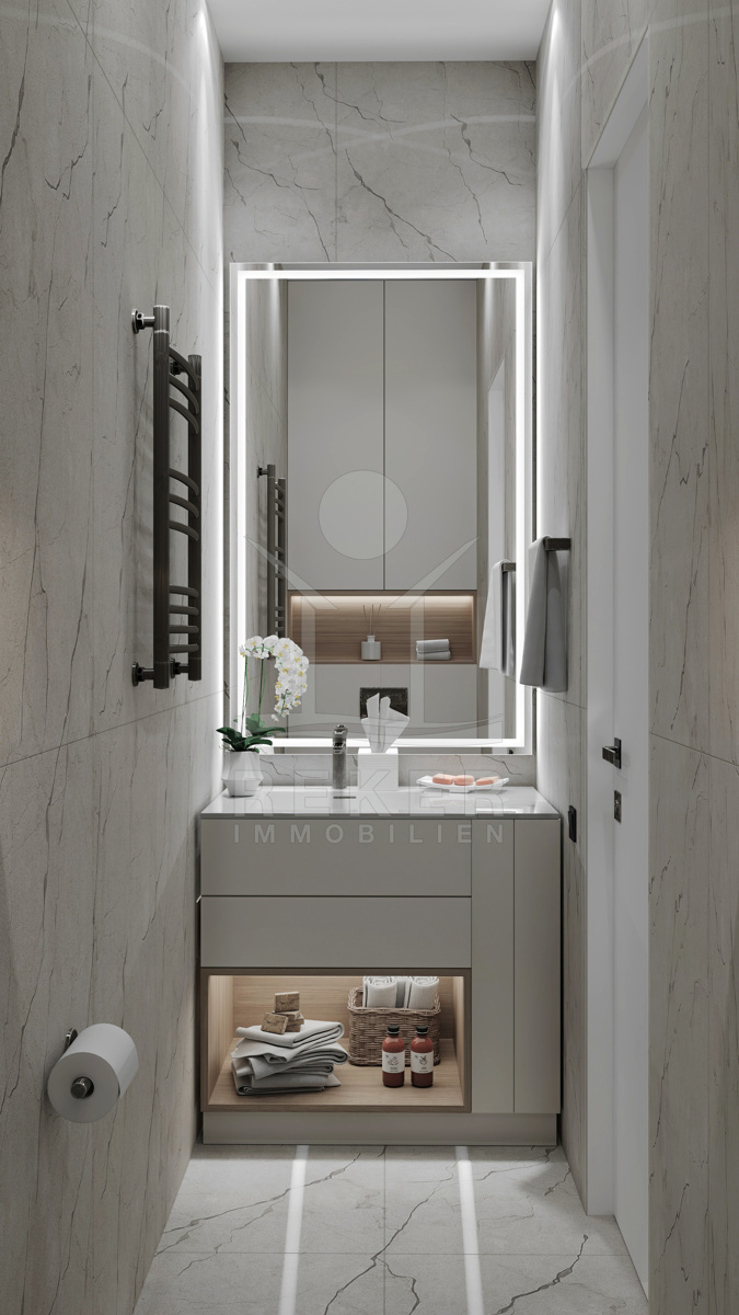Die Wohnung beeindruckt mit einer großzügigen Wohnfläche von 99 m² und einer durchdachten Raumaufteilung. Der Eingangsbereich führt in einen offenen Wohn-, Ess- und Küchenbereich, der einladend und hell ist. Zwei Schlafzimmer bieten ausreichend Platz für Ruhe und Erholung. Ein modernes Badezimmer sowie ein praktisches Gäste-WC runden das Angebot ab. Die überdachte Terrasse mit 19,37 m² lädt dazu ein, die frische Meeresbrise zu genießen und dabei den Blick auf das Wasser schweifen zu lassen. Der ideale Ort, um Zeit im Freien zu verbringen oder Gäste zu empfangen.