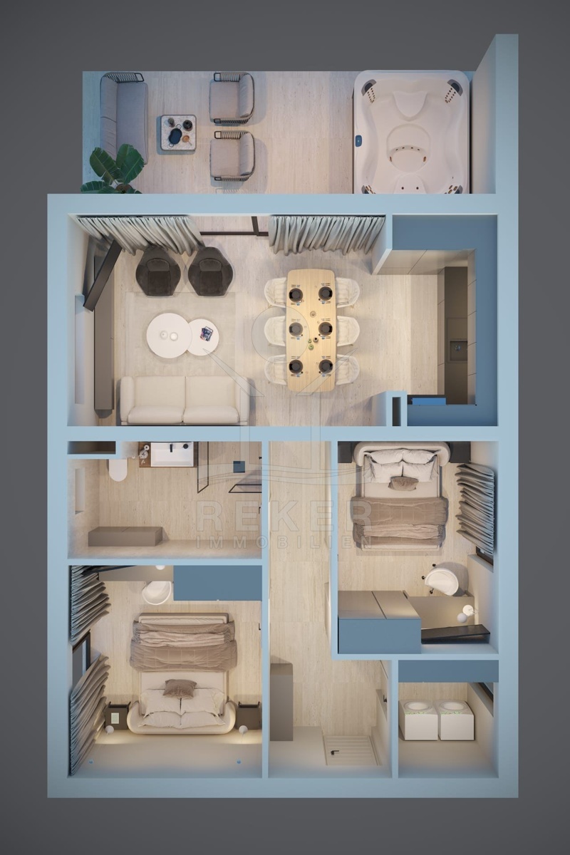 Diese Wohnung im 1. Obergeschoss ist für alle, die gerne ihren Platz haben. Mit ca. 66 m² Wohnfläche bietet sie zwei ruhige Schlafzimmer, ein helles Bad mit Fußbodenheizung und einen offenen Wohn-Essbereich mit direktem Zugang zur großen, überdachten Loggia. Die Loggia ist über 20 m² groß ... viel Raum für Lounge-Möbel, Esstisch oder einfach zum Durchatmen. Die Ausstattung ist hochwertig und funktional: Klimaanlage mit Wechselrichter, pflegeleichte Keramikfliesen, moderne PVC-Fenster und ein klar strukturierter Grundriss.