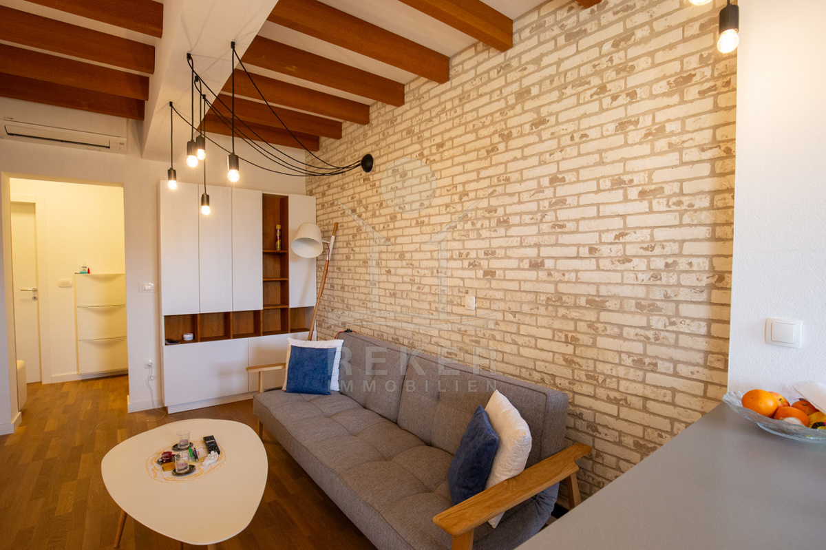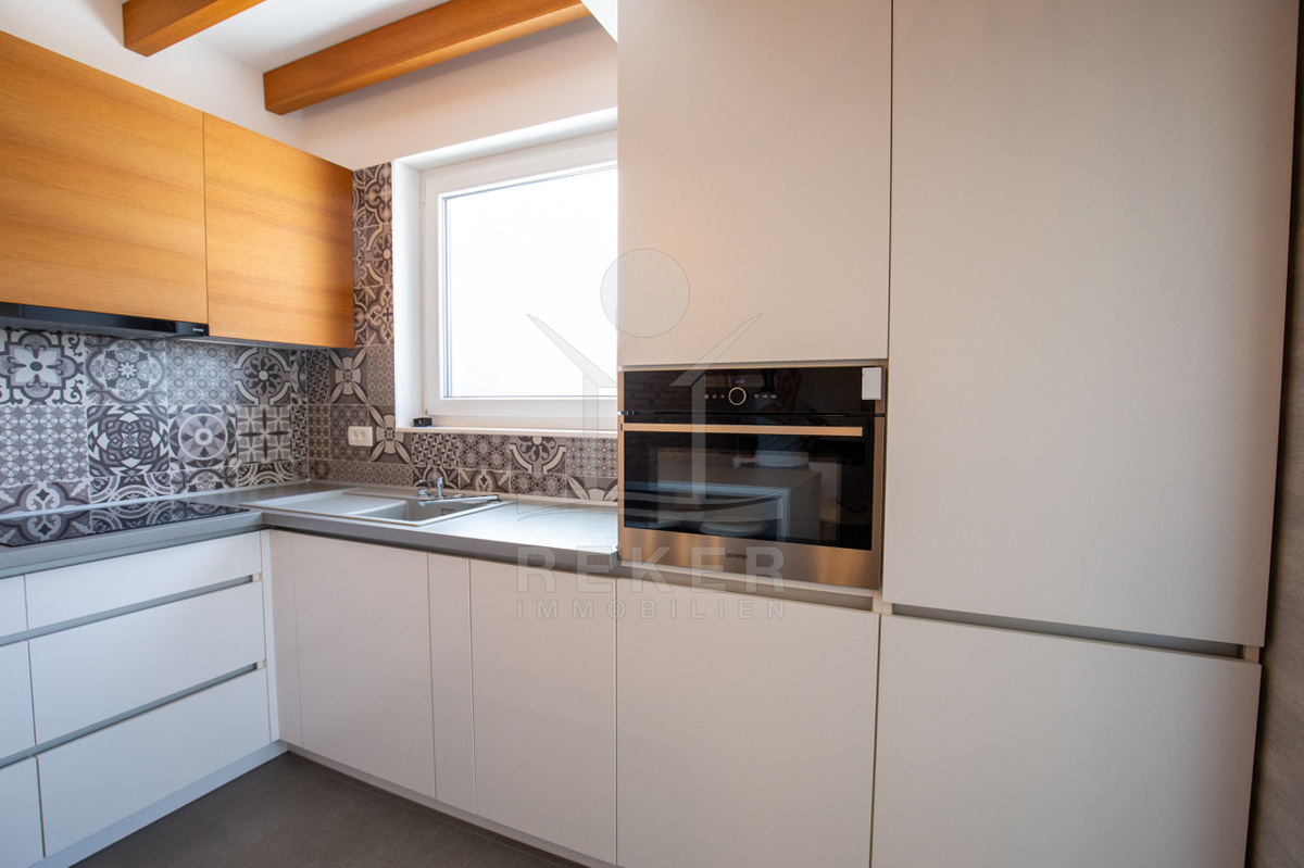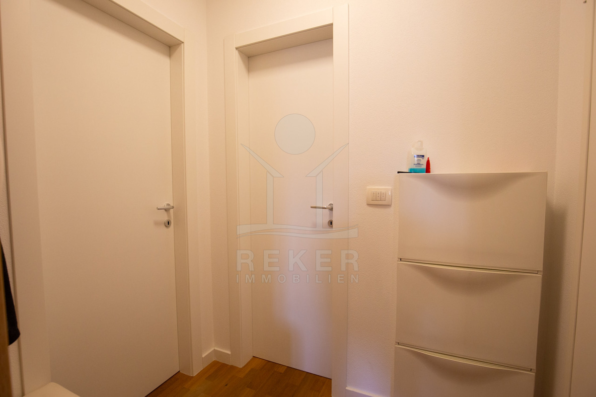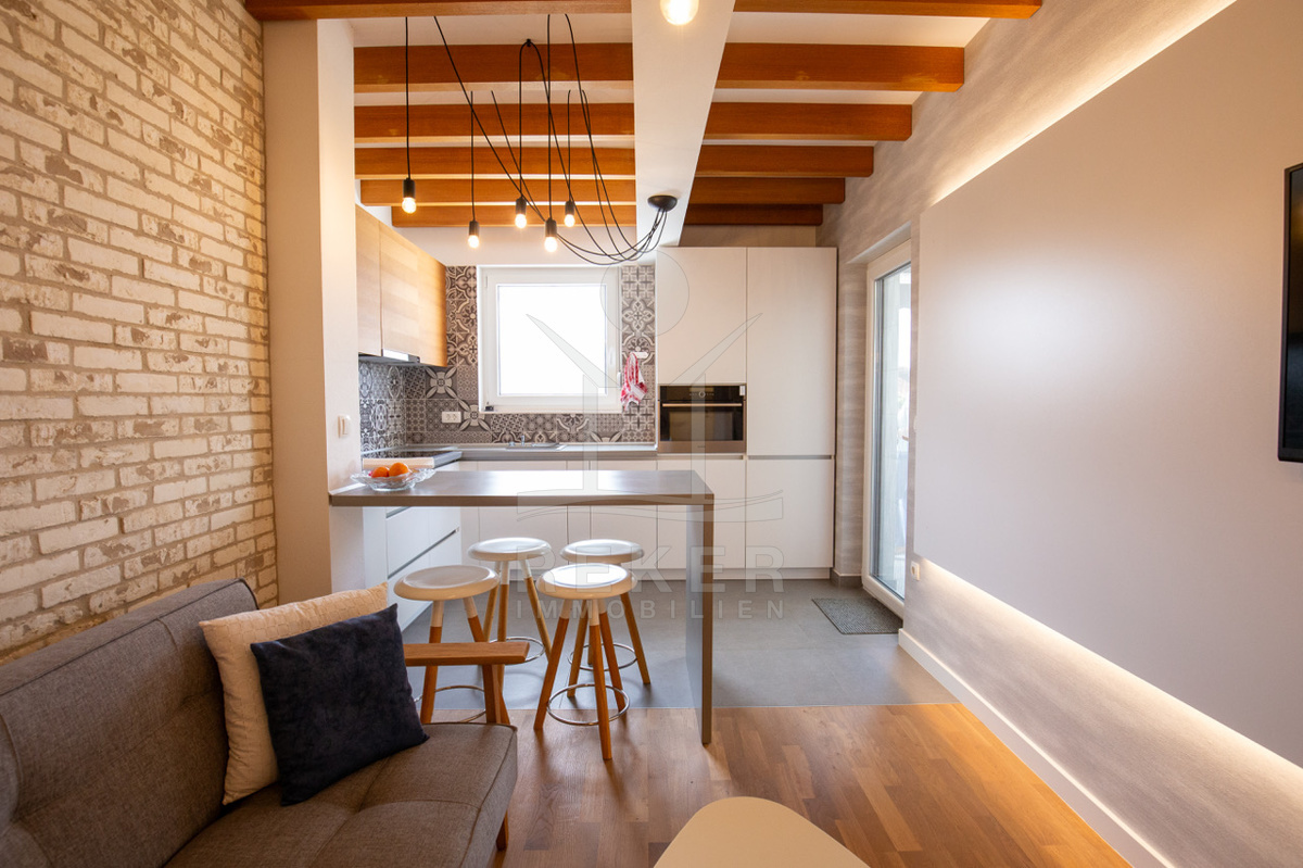 Innen erwartet Sie echte Qualität. Design-Küche, Eichenparkett, Einbauten mit klaren Linien. Alles vollmöbliert und kaum benutzt. Zwei Schlafzimmer, ein helles Bad mit bodengleicher Dusche, ein Wohnbereich mit Kamin, Fußbodenheizung und Klima. Die Wohnung ist komplett eingerichtet – einziehen, fertig. Perfekt für alle, die nicht renovieren wollen, sondern genießen.