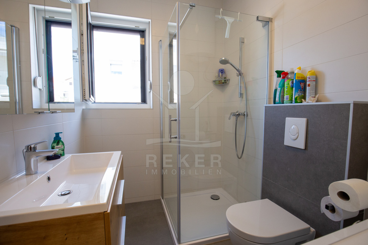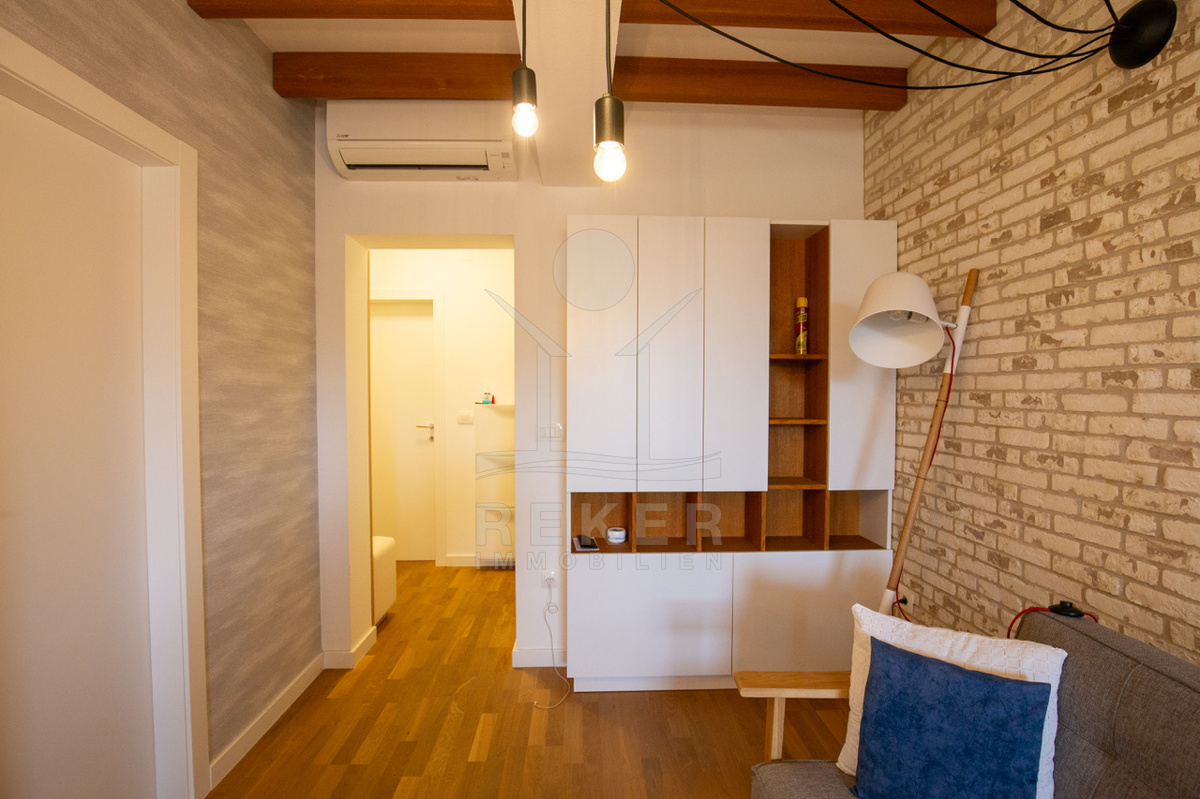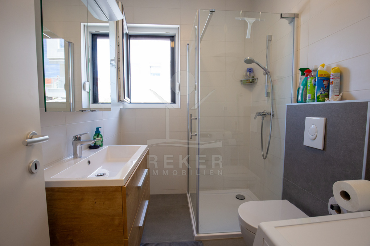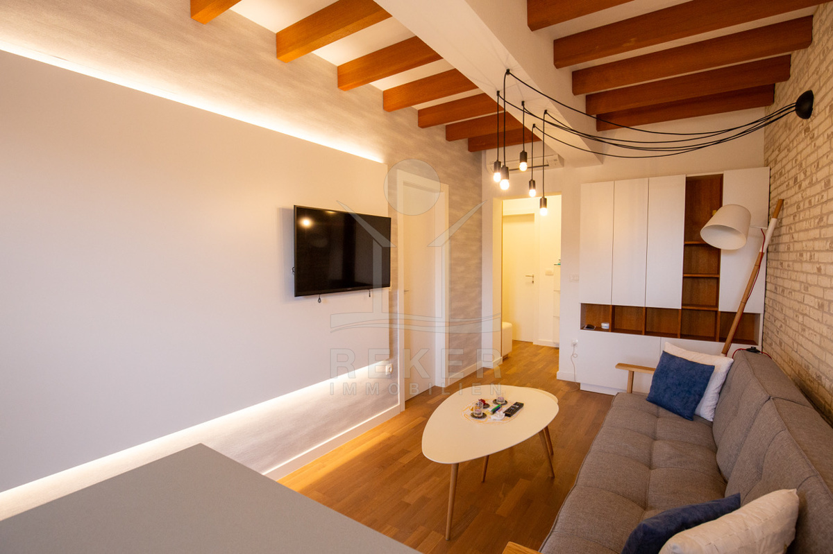 Innen erwartet Sie echte Qualität. Design-Küche, Eichenparkett, Einbauten mit klaren Linien. Alles vollmöbliert und kaum benutzt. Zwei Schlafzimmer, ein helles Bad mit bodengleicher Dusche, ein Wohnbereich mit Kamin, Fußbodenheizung und Klima. Die Wohnung ist komplett eingerichtet – einziehen, fertig. Perfekt für alle, die nicht renovieren wollen, sondern genießen.