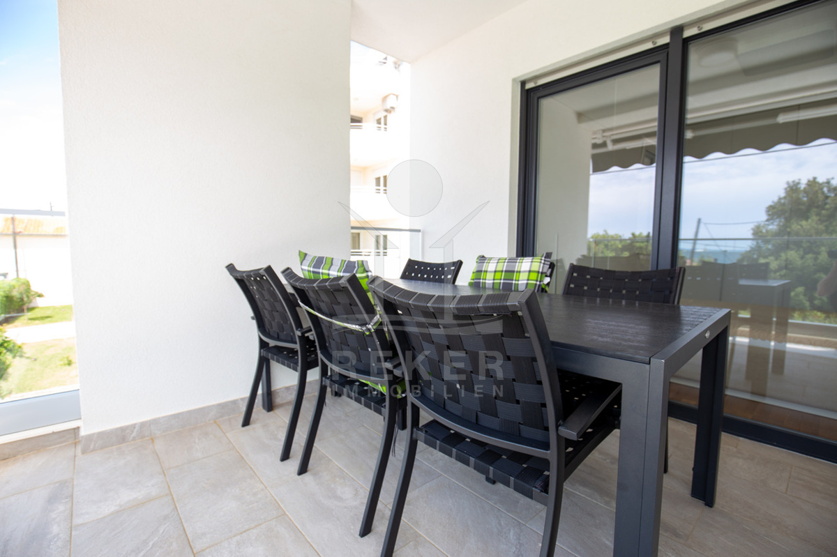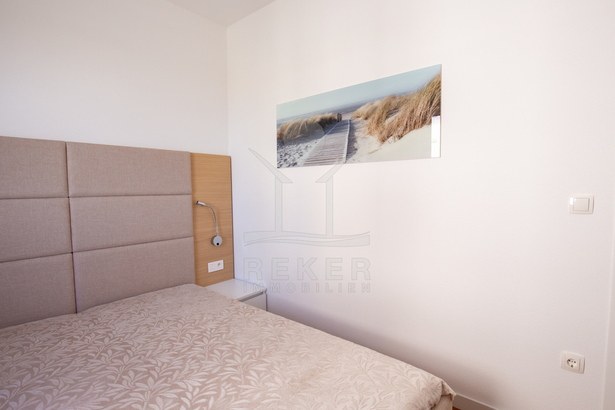 Der Balkon zeigt Richtung Südwesten. Hier scheint die Nachmittagssonne, während Sie aufs Meer blicken. Groß genug für ein Abendessen mit Gästen, überdacht, mit Markise. Zwei eigene Stellplätze sind direkt vor dem Haus reserviert – kein Parkplatzsuchen, kein Stress. Das Gebäude selbst: modern, hell, mit nur vier Wohneinheiten. Hier kennt man sich, aber jeder hat seine Ruhe.