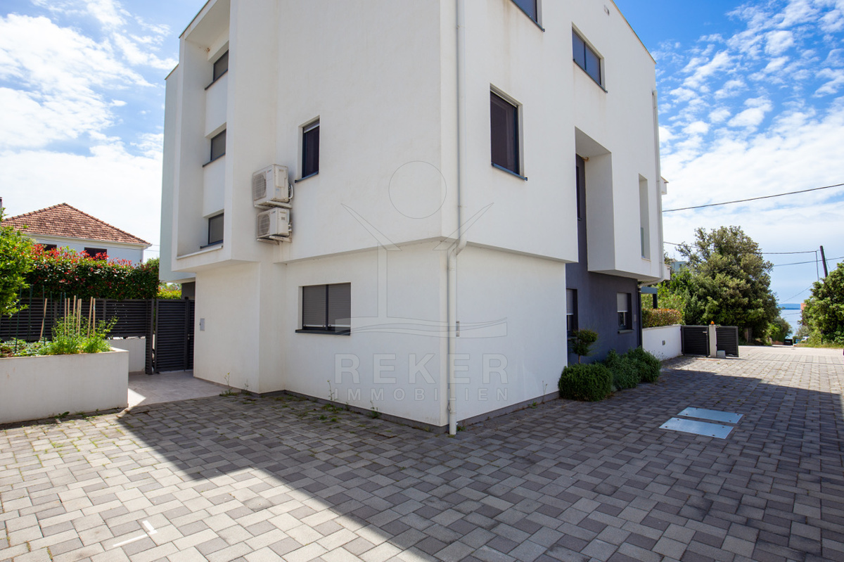 Punta Skala in Petrcane – ein Ort, der für Ruhe, Sonne und klare Luft steht. Nur wenige Schritte trennen Sie vom Meer: 150 Meter und Sie spüren den Sand unter den Füßen. Das Gebäude liegt in einer kleinen Seitenstraße, leicht erhöht und mit freiem Blick Richtung Südwesten. In die Ortsmitte sind es etwa 500 Meter. Klein, ruhig, gepflegt – genau richtig, wenn Sie nicht mittendrin, aber ganz nah dran sein wollen.