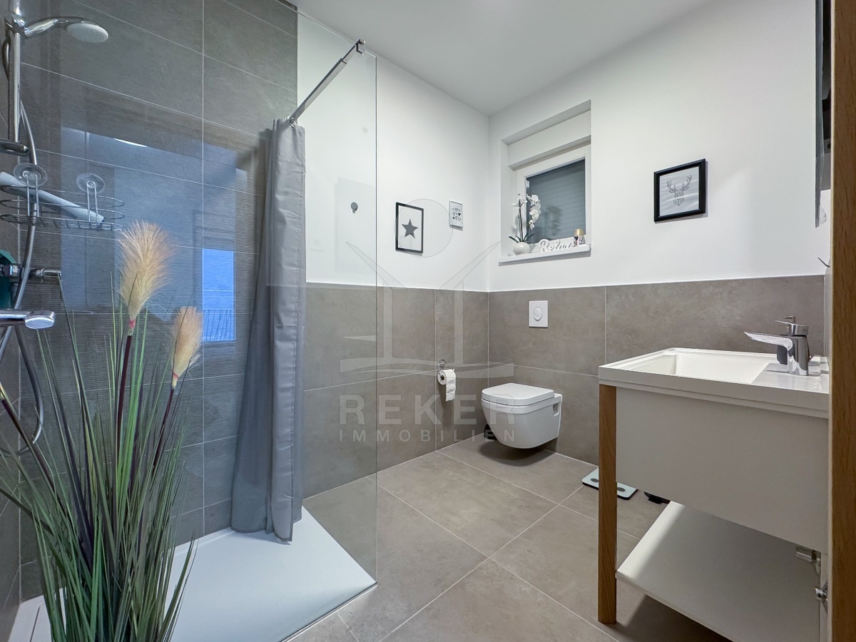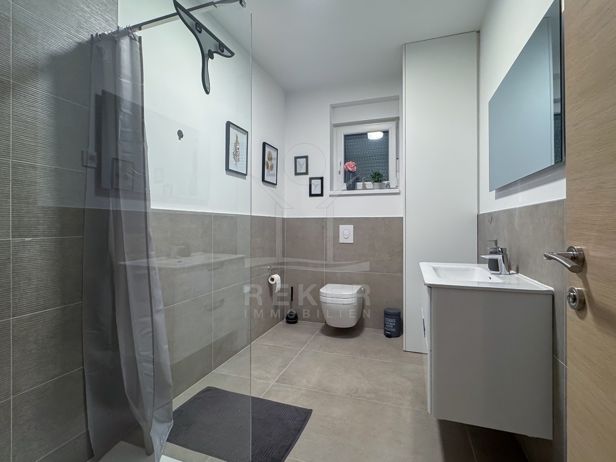 Zwei Schlafzimmer, eines davon mit Zugang zur Terrasse, und zwei elegante Badezimmer vervollständigen das Raumangebot. Maßgefertigte Möbel, edle Oberflächen und ein stimmiges Farbkonzept verleihen der Wohnung einen modernen, stilvollen Charakter. Klimaanlage, PVC-Fenster und energieeffiziente Bauweise sorgen für angenehmes Wohnen das ganze Jahr über.