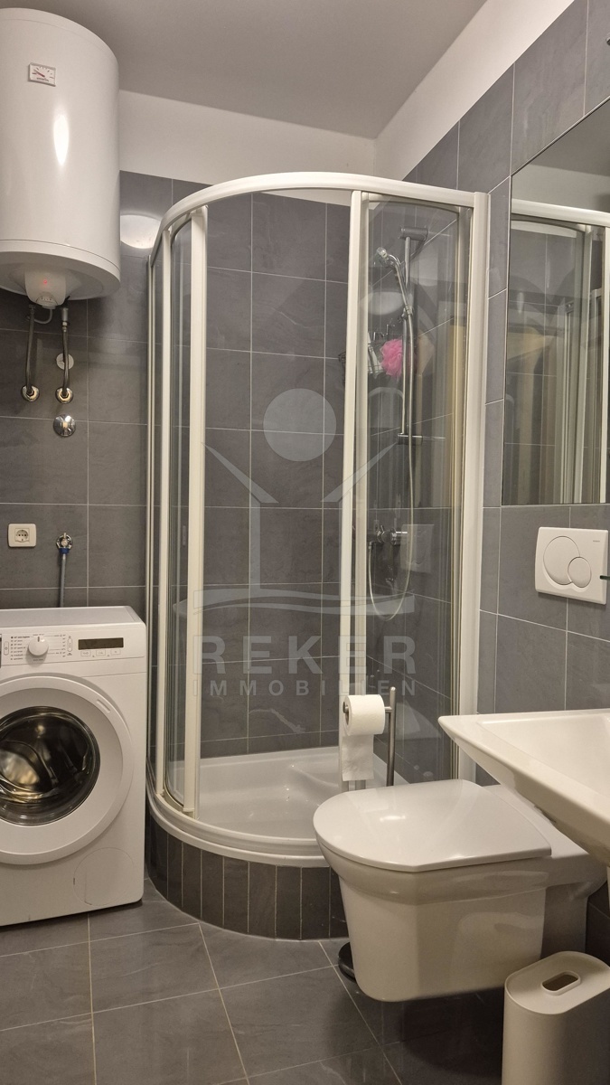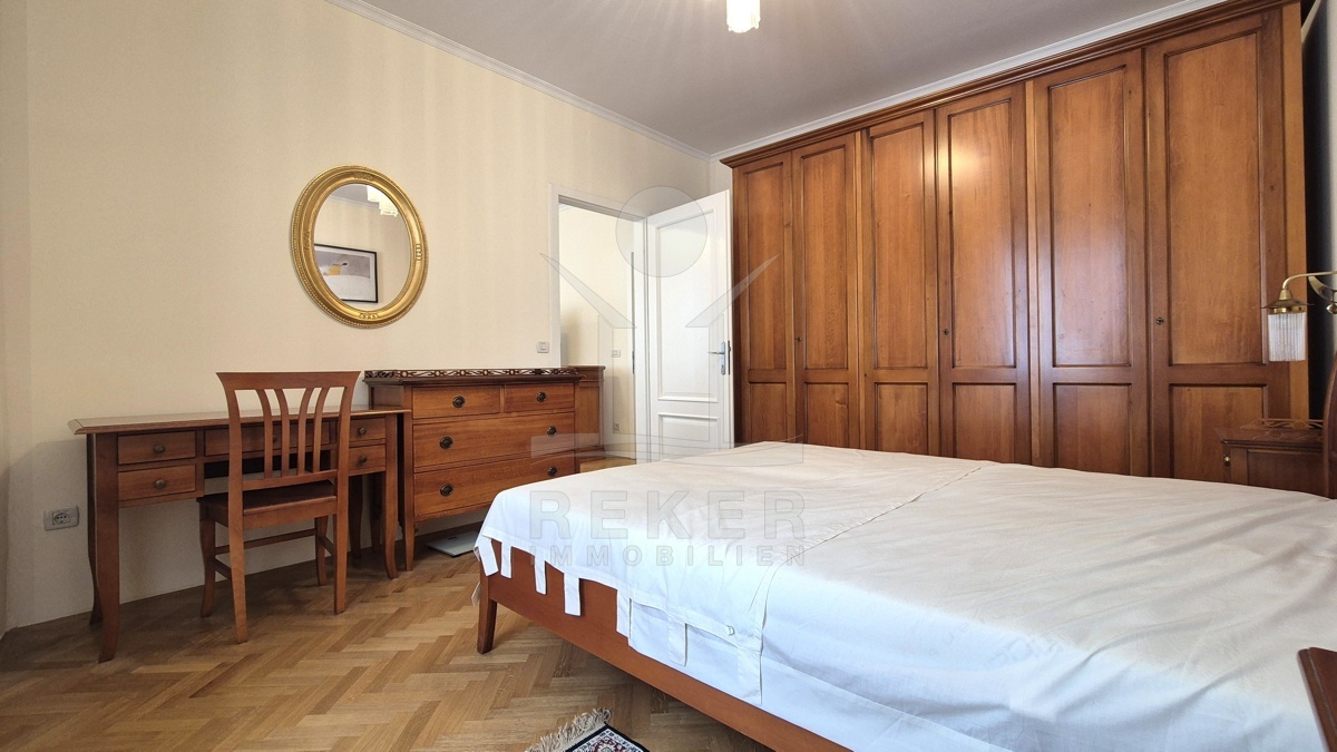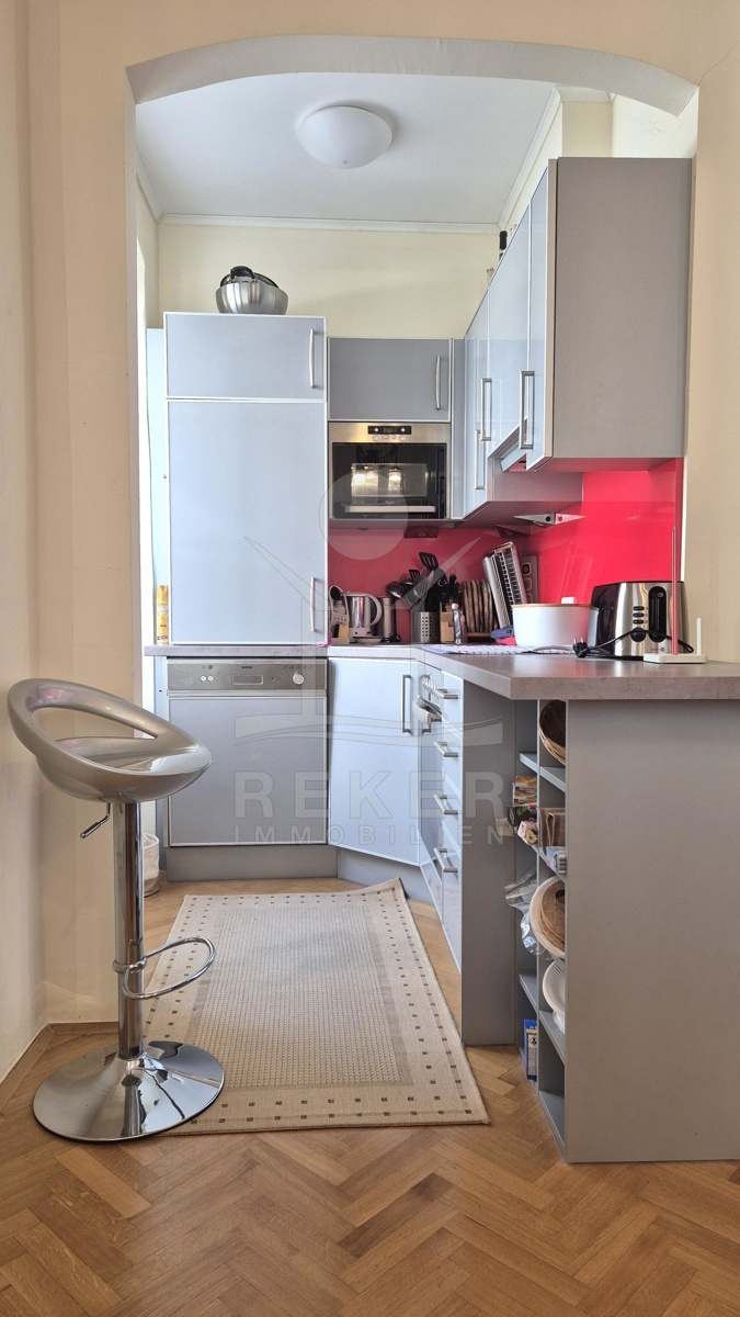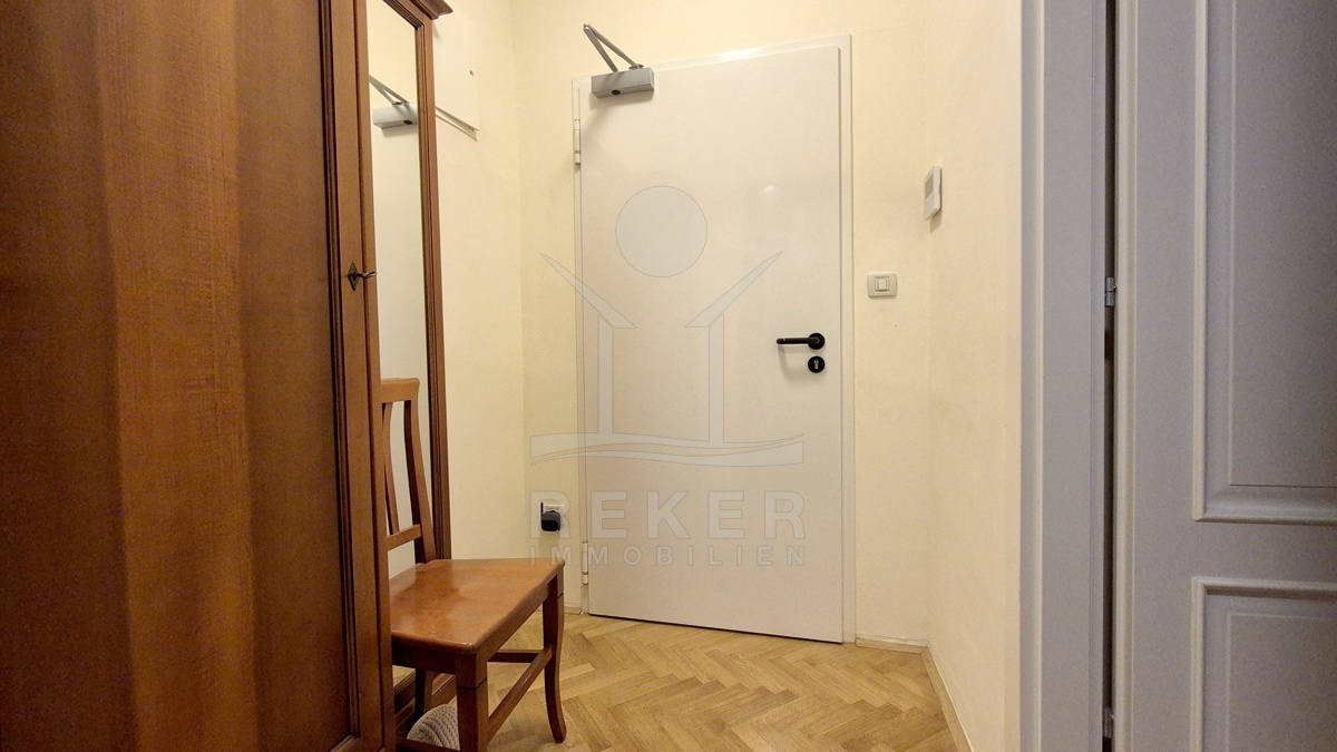 Die Wohnung Top 1 befindet sich im ersten Obergeschoss. Gleich beim Eingang ein kleiner Vorraum mit Garderobe. Von hier aus geht’s direkt ins Bad: modern gefliest, mit Dusche, WC, Waschbecken und Waschmaschine. Im Mittelpunkt steht der offene Wohnbereich. Echtholz-Parkett, viel Licht, klassisches Mobiliar. Der Essplatz ist klar gegliedert, dazu eine Theke mit Barhockern. Die Küche ist kompakt, aber komplett ausgestattet: Backofen, Spüle, Geschirrspüler, Mikrowelle – alles dabei. Das Schlafzimmer liegt separat und bietet genug Raum für Bett, Kommode und einen großen Kleiderschrank. Die Fenster sind saniert, die Raumhöhe großzügig. Gekühlt wird über das zentrale Klimasystem, das auch heizt und lüftet. Alles kann individuell eingestellt werden – für Sommer wie Winter perfekt. Die Wohnung ist hochwertig möbliert und kann sofort genutzt oder vermietet werden.