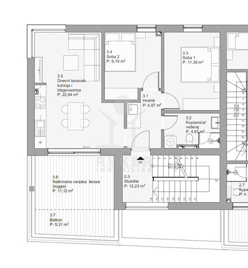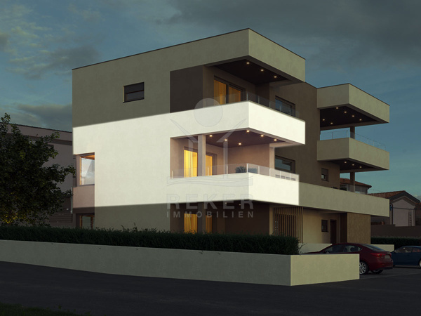 Das Gebäude umfasst vier Wohnungen auf drei Ebenen. Im Erdgeschoss und im ersten Stock entstehen zwei identische Einheiten. Darüber befindet sich das Penthouse mit großzügigem Blick auf das Meer. Eine weitere Wohnung erstreckt sich über zwei Etagen, unten mit Wohnbereich, oben mit Schlafzimmern. Jede Einheit bietet eine eigene Terrasse oder einen Balkon, perfekt, um die Umgebung auf sich wirken zu lassen. Die Architektur überzeugt mit klarer, moderner Formensprache und einem Fokus auf Raumgefühl und Aussicht.