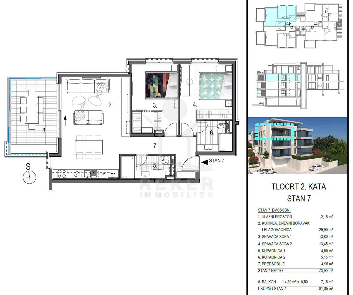 Wer hoch wohnt, sieht mehr – und genau das bietet diese Wohnung im zweiten Stock. Zwei Schlafzimmer, zwei Bäder, eine offene Wohnküche mit Essplatz und Zugang zur Loggia machen die 73,90 m² Innenfläche rundum stimmig. Die große Loggia mit 14,30 m² öffnet sich zum Meer hin – perfekt für alle, die ihre Zeit gern draußen verbringen. Ob Frühstück mit Blick oder ein Glas Wein am Abend: Der Ausblick ist da, die Sonne auch. Die Höhe bringt Privatsphäre und Weitblick in einem.