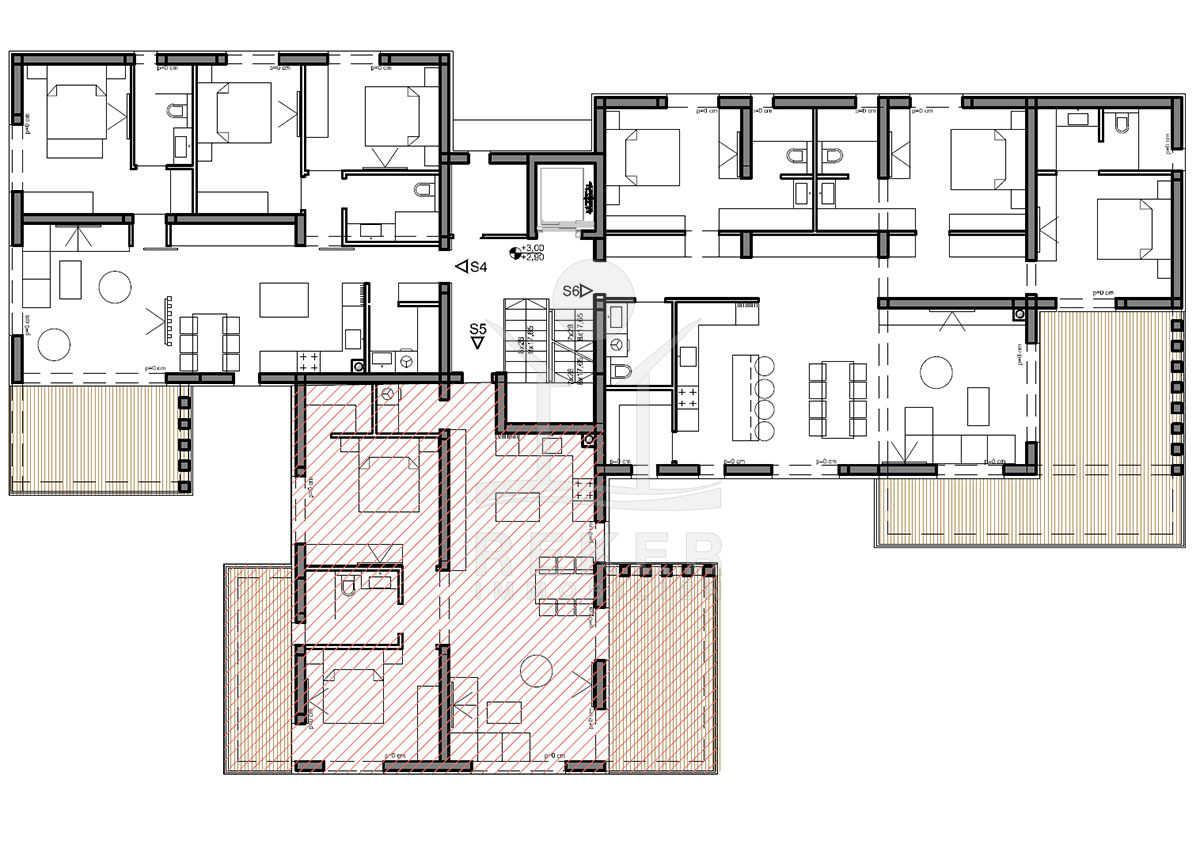 Das Gebäude erstreckt sich über drei Etagen: Das Erdgeschoss umfasst drei Wohnungen mit jeweiligem Garten, während das erste Obergeschoss ebenfalls drei Wohnungen beherbergt. Im zweiten Obergeschoss befinden sich drei Penthouse-Wohnungen, die jeweils über eine Dachterrasse verfügen und einen herrlichen Ausblick auf die Umgebung bieten. Ein Aufzug erleichtert den Zugang zu den verschiedenen Etagen. Der Neubau wird mit erstklassigen Materialien gefertigt und zeichnet sich durch ihre südliche Ausrichtung aus, die für eine optimale Belichtung sorgt.