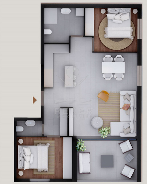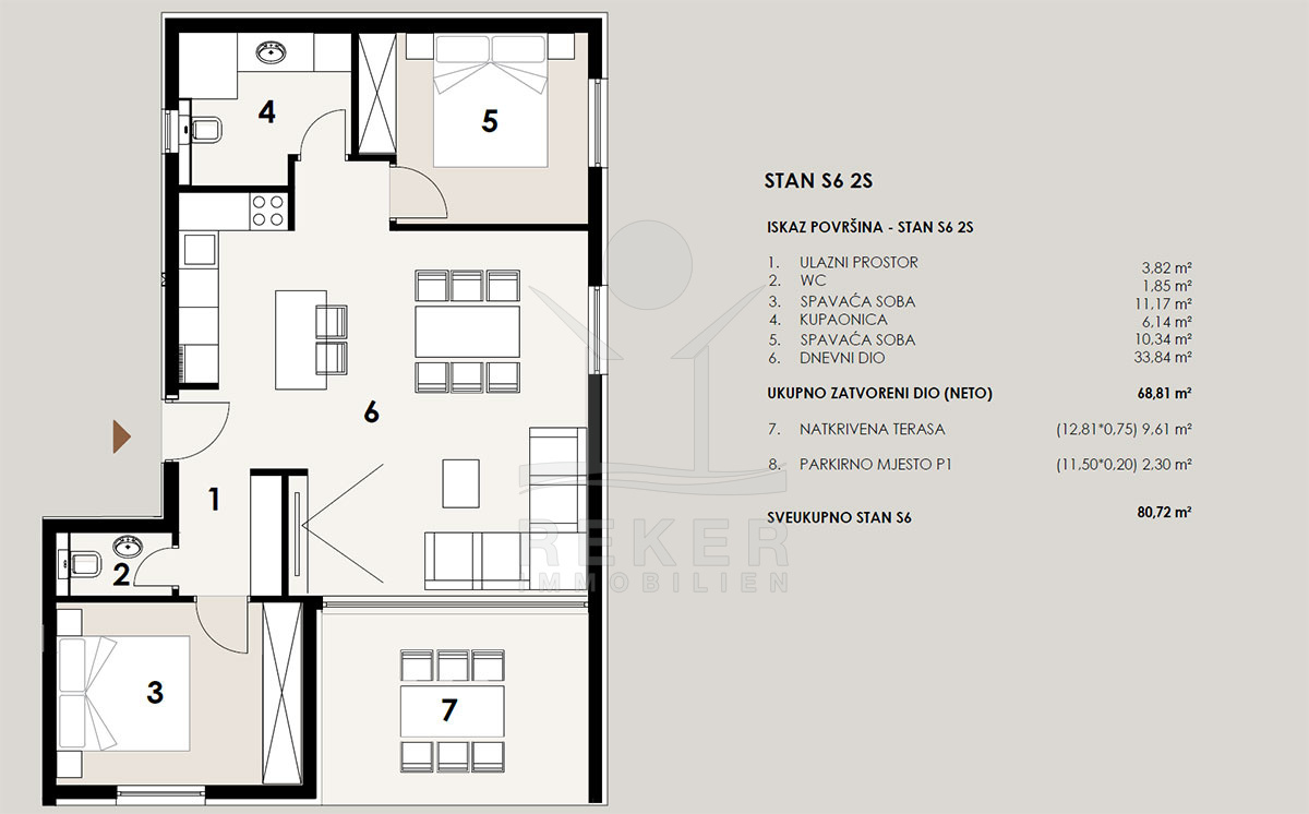 Diese Wohnung im 1. Obergeschoss bietet Ihnen 68,81 m² Innenfläche und eine klare Raumfolge. Zum Angebot gehören ein offener Wohn- und Essbereich, zwei Schlafzimmer, ein Badezimmer und ein separates Gäste-WC. Große Fensterflächen bringen viel Helligkeit in die Räume und geben ihnen eine freundliche Wirkung. Die Ausstattung passt gut zu einem gehobenen Standard. Sie nutzen eine Klimaanlage zum Heizen und Kühlen, eine Fußbodenheizung in allen Wohnräumen außer den Schlafzimmern, elektrische Rollläden, einbruchsichere Türen und eine Video-Türsprechanlage. Komfort, der den Alltag spürbar erleichtert. Der südlich ausgerichtete Balkon mit 12,81 m² bietet Panorama-Meerblick und Sonne über den ganzen Tag. Er schafft einen angenehmen Platz im Freien.