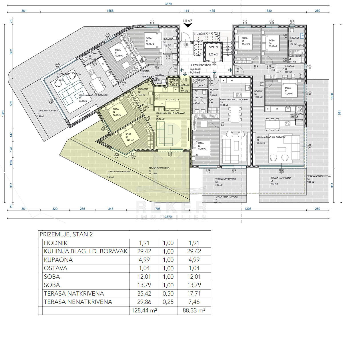 Das Apartment befindet sich in Erdgeschoss in einem Wohngebäude mit insgesamt 18 Wohneinheiten, verteilt auf 4 Etagen, in der ideal gelegenen Umgebung bei Rijeka. Der Baubeginn ist für Herbst 2024 geplant, was Ihnen die Möglichkeit gibt, Ihre neue Traumwohnung nach Ihren Vorstellungen zu gestalten. Die Wohnung wird mit hochwertigen Ausstattungsdetails wie Wärmepumpen zur Heizung und Kühlung, Fußbodenheizung in den Badezimmern, elektrischen Jalousien, Insektenschutznetzen, Aufzug und einem bequemen Treppenhaus ausgestattet sein.