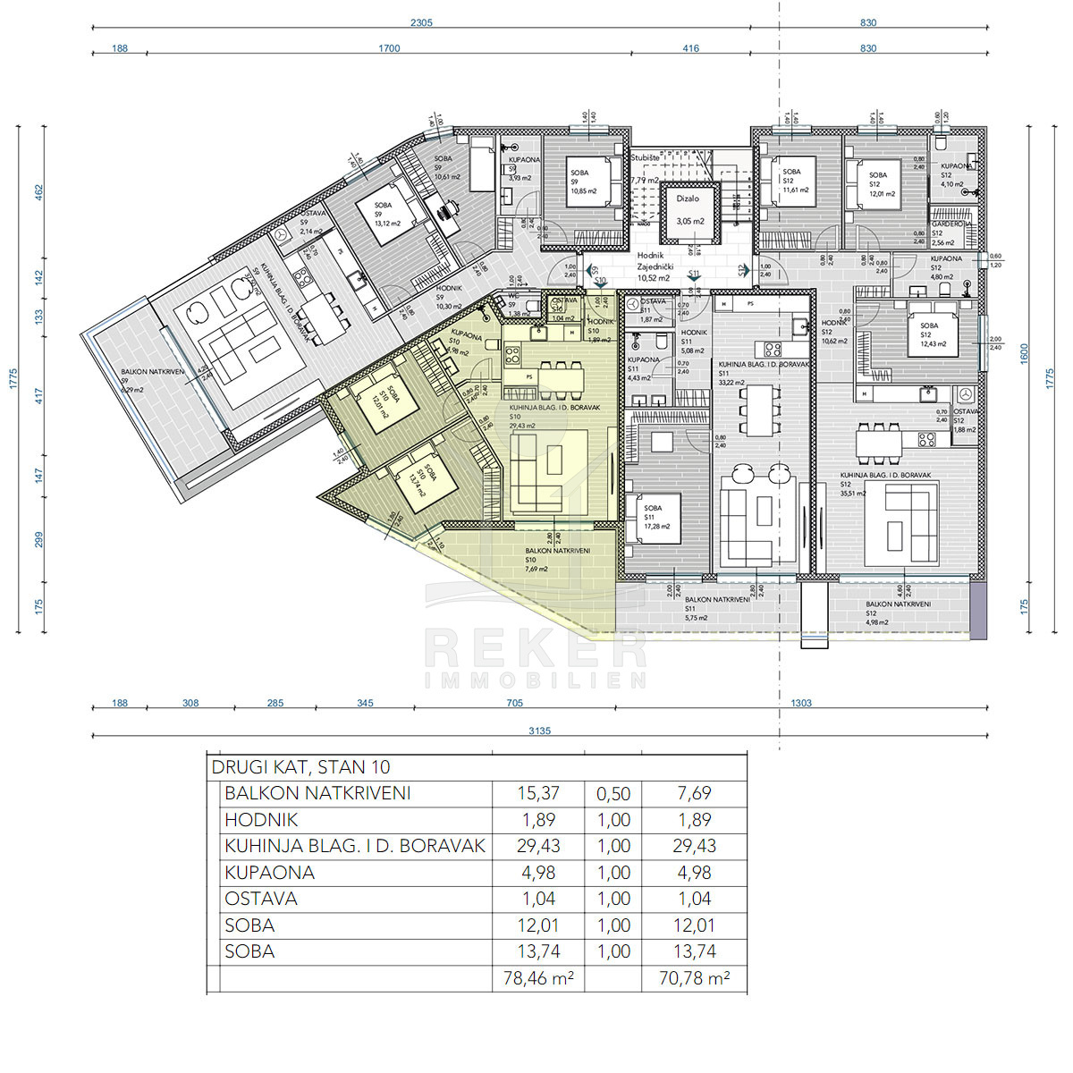 In Rijeka entsteht ein geplantes Wohngebäude, das eine hochmoderne und luxuriöse Neubauwohnung im 2. Stock beherbergen wird. Der Baubeginn ist für Herbst 2024 geplant, und die Wohnung wird Teil eines modernen Komplexes mit insgesamt 18 Wohnungen sein, die sich auf 4 Etagen verteilen. Die Ausstattung der Wohnung wird topmodern sein, von Wärmepumpen über Fußbodenheizung in den Badezimmern bis hin zu elektrischen Jalousien. Ein Aufzug und ein bequemes Treppenhaus sorgen für Komfort, während in der Tiefgarage 2 Stellplätze und ein Abstellraum zur Verfügung stehen. Zudem wird die Infrastruktur für das Laden von Elektroautos bereits vorbereitet, um zukünftig entsprechende Steckdosen installieren zu können.