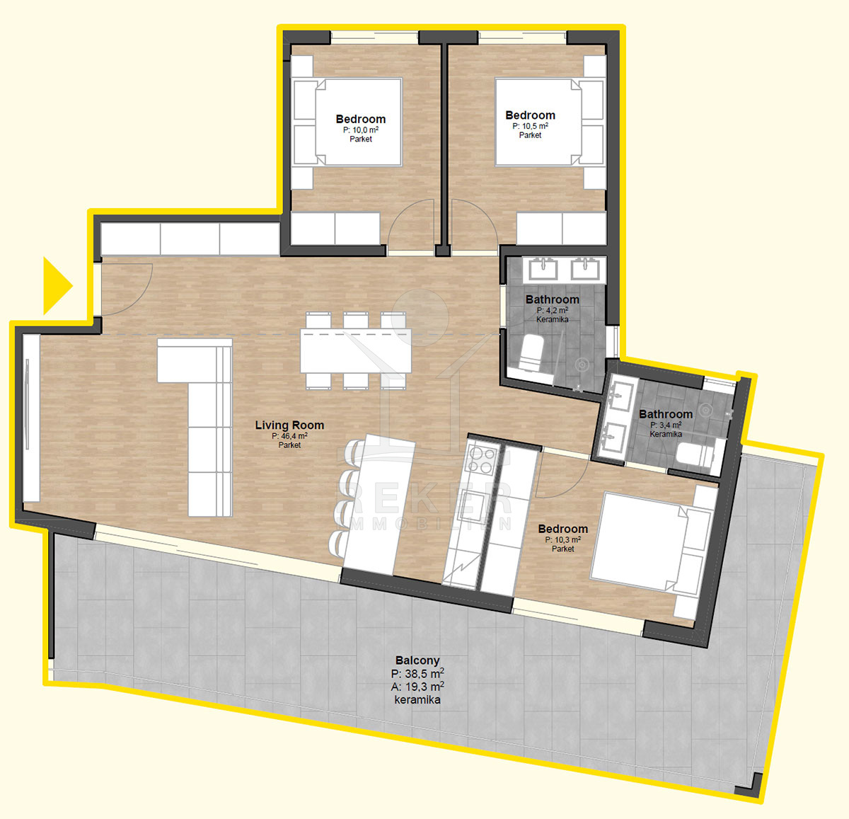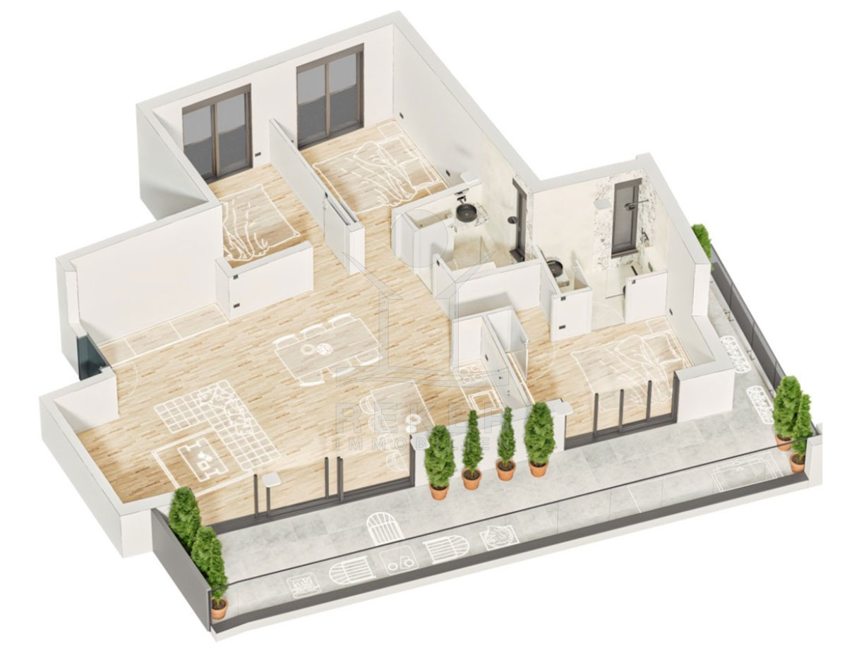 Mit 84,71 m² Wohnfläche bietet die Wohnung S3 ein angenehmes Raumgefühl. Drei Schlafzimmer und zwei Badezimmer geben Familien und Paaren eine klare Struktur und viel Komfort. Der offene Wohn- und Essbereich zeigt nach Süden und öffnet sich über große Glasflächen zur Terrasse. Eichenparkett in erster Kategorie bringt Wärme in die Räume. Italienische Keramik setzt moderne Akzente. Aluminiumfenster mit Dreifachverglasung fördern Helligkeit und Energieeffizienz. Das Multi-Split-System mit Wärmepumpe sorgt für angenehme Temperaturen. In den Badezimmern erhöht eine Fußbodenheizung den Komfort. Ein rundes Gesamtbild.