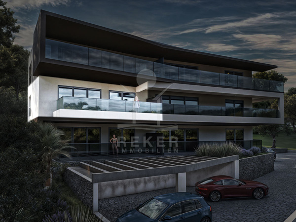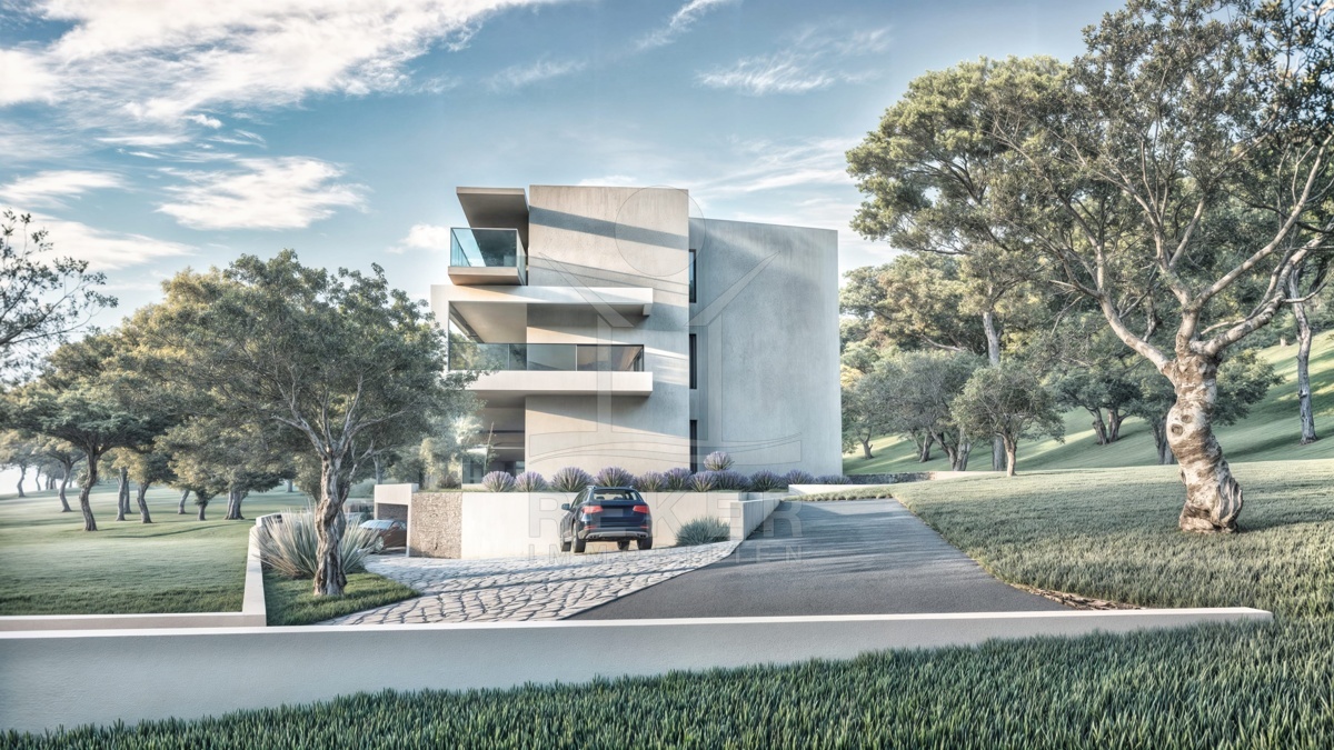 In einer stillen Seitenbucht, rund 30 Meter vom Meer entfernt, entsteht ein modernes Wohngebäude mit sechs exklusiven Apartments. Klare Linien, Glas und helle Materialien bestimmen die Architektur. Das Gebäude fügt sich gut in die Landschaft ein und schafft eine ruhige, elegante Stimmung. Für jede Einheit steht ein eigener Parkplatz bereit. Die Außenflächen sind gepflegt, mit mediterranen Pflanzen und gepflasterten Wegen. Ein Ort mit viel Privatsphäre.