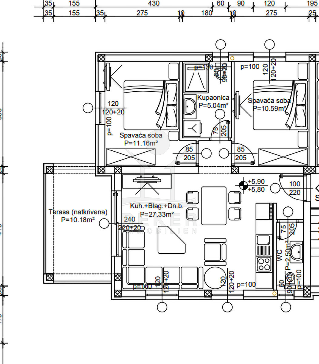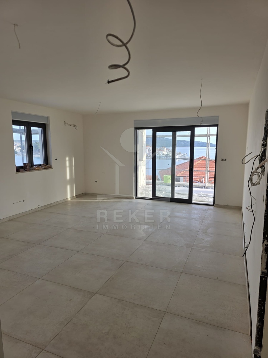 Nur 60 Meter zum Meer. Das Haus steht in dritter Reihe in Rogoznica, leicht am Hang. Das bringt einen besseren Blick aufs Meer. Ruhige Nachbarschaft, kurze Wege, klare Struktur. Und: Jeder hat seinen eigenen Parkplatz direkt vorm Haus. Sieben Wohnungen. Vier Etagen. Fertig im Sommer 2025. Neubau, Erstbezug, saubere Linien.