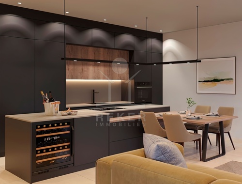 Im Inneren überzeugt die Wohnung mit ihrer südwestlichen Ausrichtung und großen Glasschiebetüren, die für viel Helligkeit sorgen. Der offene Wohn-, Ess- und Kochbereich umfasst rund 35–38 Quadratmeter und öffnet sich direkt zur Loggia. Zwei Schlafzimmer bieten Komfort und Ruhe. Das größere verfügt über ein eigenes Bad, das zweite über einen direkten Zugang zur Terrasse. Dazu kommen ein weiteres Badezimmer, ein Flur und eine praktische Waschküche.