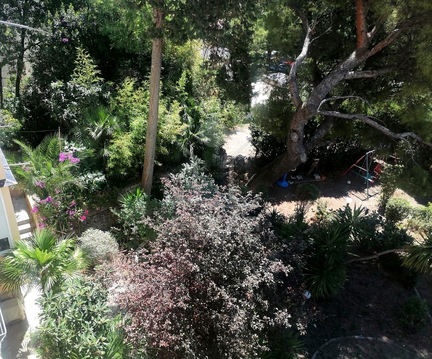 Das Apartment erstreckt sich über 75 m² auf der dritten Etage eines vierstöckigen Gebäudes. Die hohe Deckenhöhe von 2,90 m verleiht der Wohnung ein großzügiges Raumgefühl. Obwohl sie renovierungsbedürftig ist, bietet sie zahlreiche Möglichkeiten zur Raumveränderung, da die meisten Wände nicht tragend sind. Zudem gehört ein praktischer Holzschuppen/Werkstatt im Keller zur Wohnung, der mit Strom versorgt wird. Ein Stellplatz für ein Auto sowie ein gemeinsamer Stellplatz für Motorräder ergänzen das Angebot. Das Grundstück rund um das Gebäude wird durch einen großen, gemeinschaftlich genutzten und umzäunten Garten bereichert, der mit üppigem Grün und mediterranen Pflanzen angelegt ist. Dies schafft eine entspannende Oase im Herzen der Stadt, in der die Bewohner die Natur genießen und sich zurückziehen können.