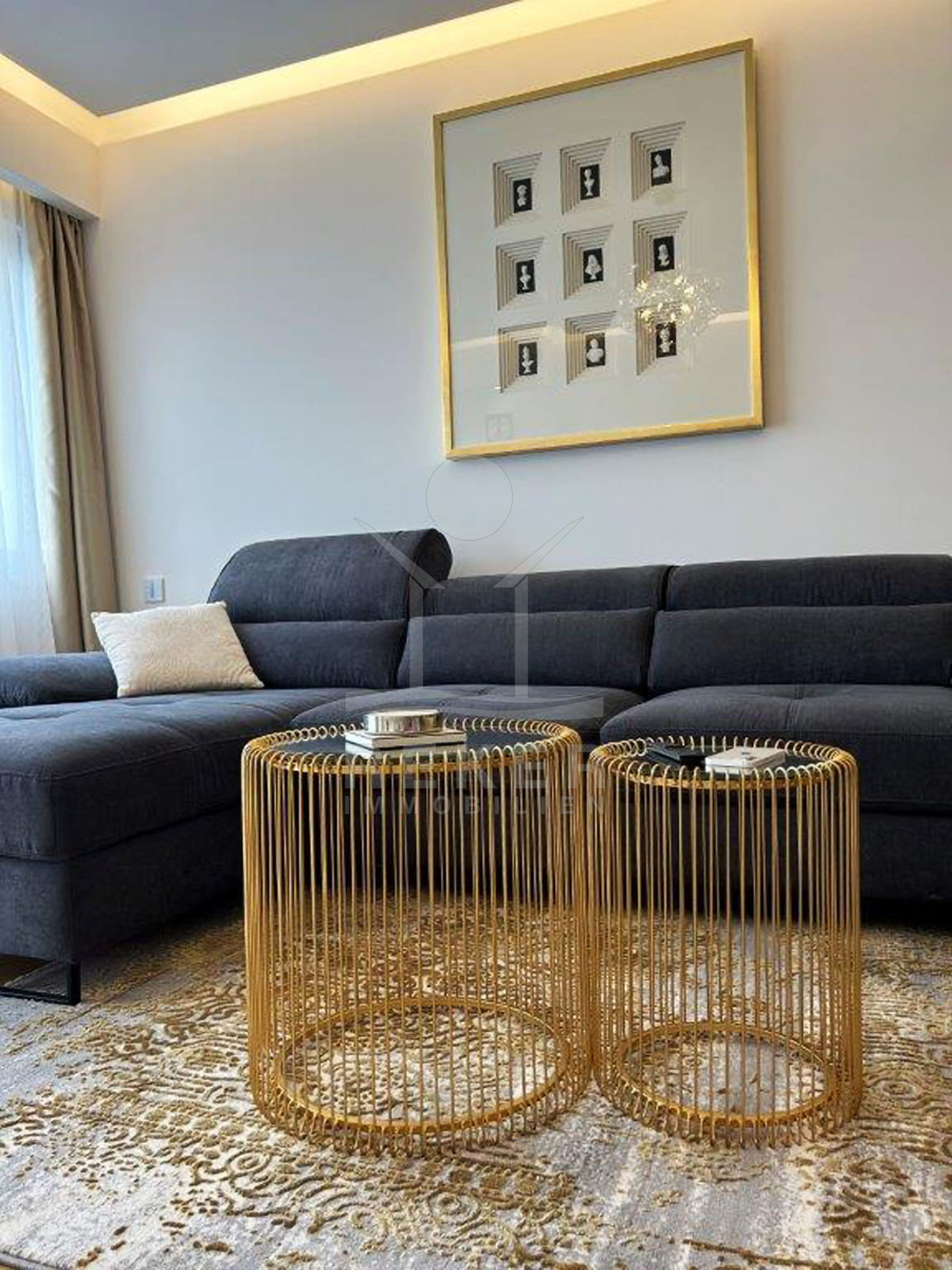 Das Apartment wird inklusive Möbeln verkauft, sodass Sie sofort einziehen können. Das geräumige Wohnzimmer bietet viel Platz für geselliges Beisammensein und entspanntes Wohnen.