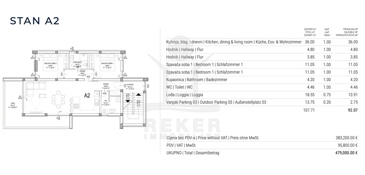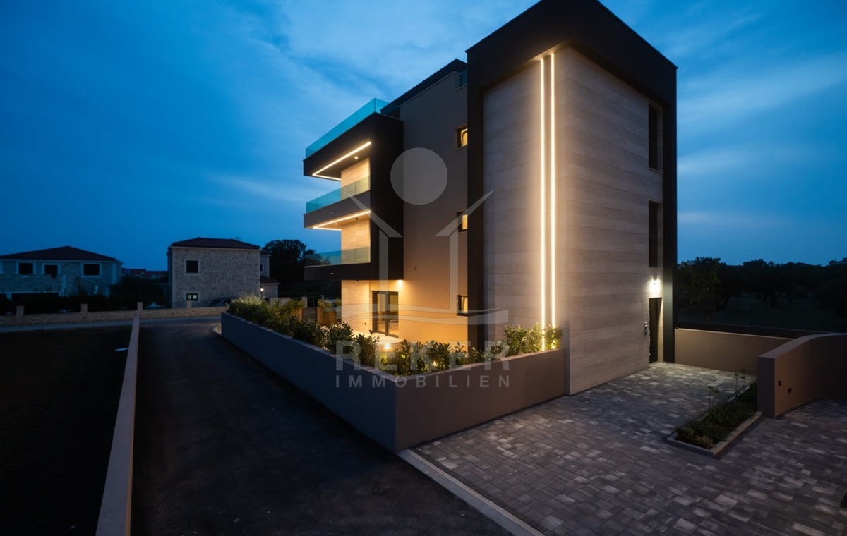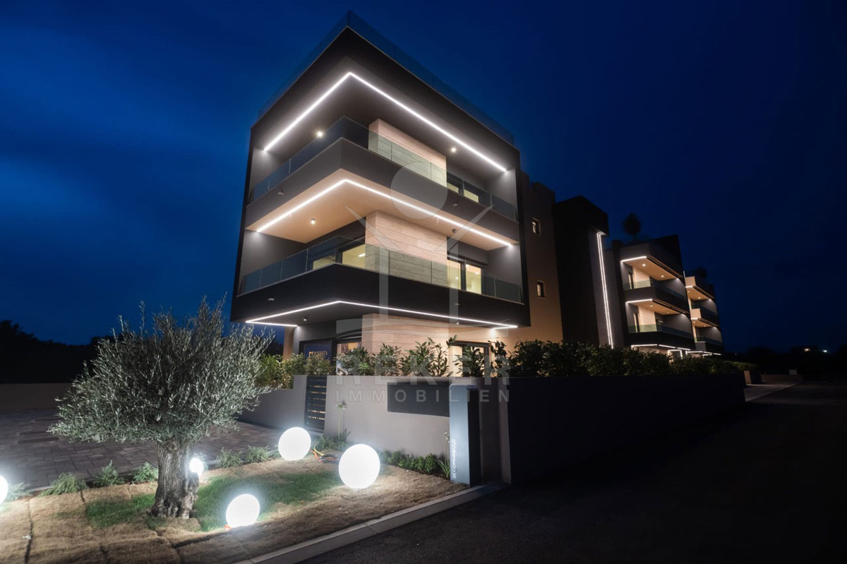 Im ruhigen, grünen Teil von Sukošan entsteht ein exklusives Wohnprojekt mit nur drei Wohnungen. Jede umfasst eine komplette Etage: Erdgeschoss, erstes und zweites Obergeschoss, dazu eine private Dachterrasse. Die Umgebung zeigt mediterranen Charakter: alte Olivenbäume, duftende Kräuter, weite Blicke. Nur 400 Meter trennen Sie vom Meer. Sonne, Ruhe und Meerblick in südlicher Ausrichtung machen diesen Ort besonders.