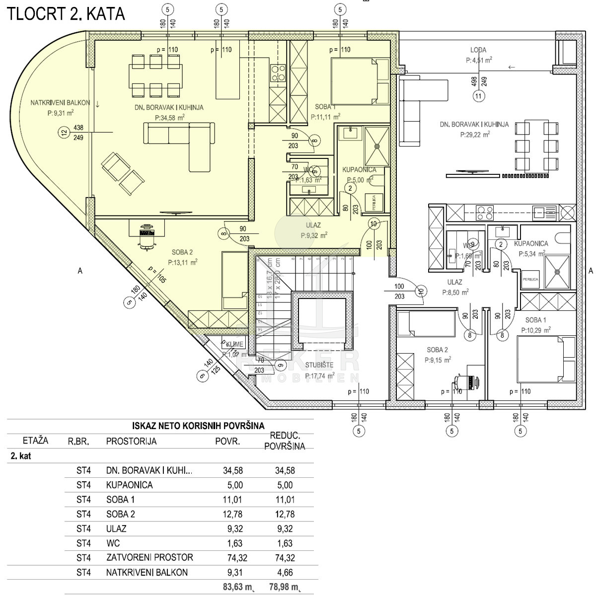 Im zweiten Obergeschoss befindet sich diese großzügig geschnittene Wohnung mit Ausrichtung nach Südwesten. Der offene Wohn Essbereich ist mit über 34 Quadratmetern das Herzstück – hier ist viel Platz für Alltag, Gäste oder einfach nur Ruhe. Vom Wohnraum aus geht es direkt auf den überdachten Balkon. Die Sonne kommt am Nachmittag, der Blick reicht bis zum Meer.