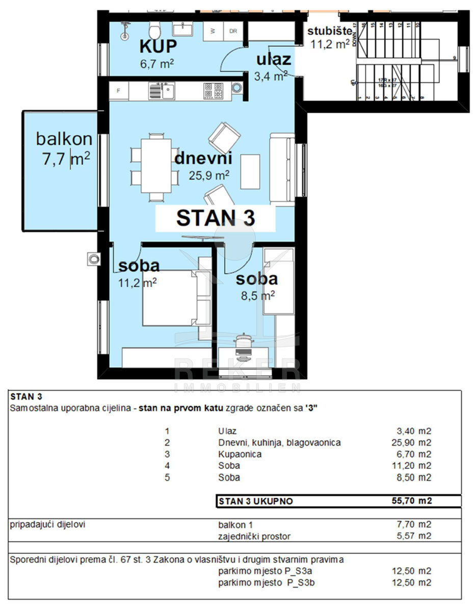 Diese Wohnung im ersten Stock bringt 55,7 m² Wohnfläche mit – zwei Schlafzimmer, ein Wohnbereich mit offener Küche und ein Badezimmer. Der Grundriss ist kompakt, aber gut strukturiert. Alle Räume sind sinnvoll angeordnet und hell. Dazu gehört ein Balkon mit 7,7 m² – das ist mehr als ein kleines Extra. Frühstück im Freien, ein Buch in der Sonne oder einfach mal durchatmen. Der Balkon ist ein echter Pluspunkt für Alltag und Freizeit.