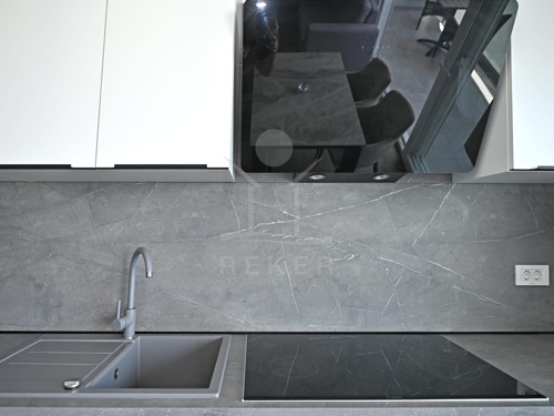 Im zweiten Stock erwartet Sie ein stimmiges Zusammenspiel aus Komfort und mediterranem Flair. Der offene Wohnbereich verbindet Wohnen, Essen und Kochen zu einem hellen, freundlichen Raum. Hochwertige Miele-Geräte und stilvolles Design schaffen eine Atmosphäre, in der man sich sofort wohlfühlt. Große Fenster holen Licht und Weite ins Innere. Von hier aus betreten Sie die 8,32 m² große Loggia mit freiem Blick auf das Meer. Die westliche Ausrichtung schenkt jeden Abend ein beeindruckendes Farbenspiel über der Adria.