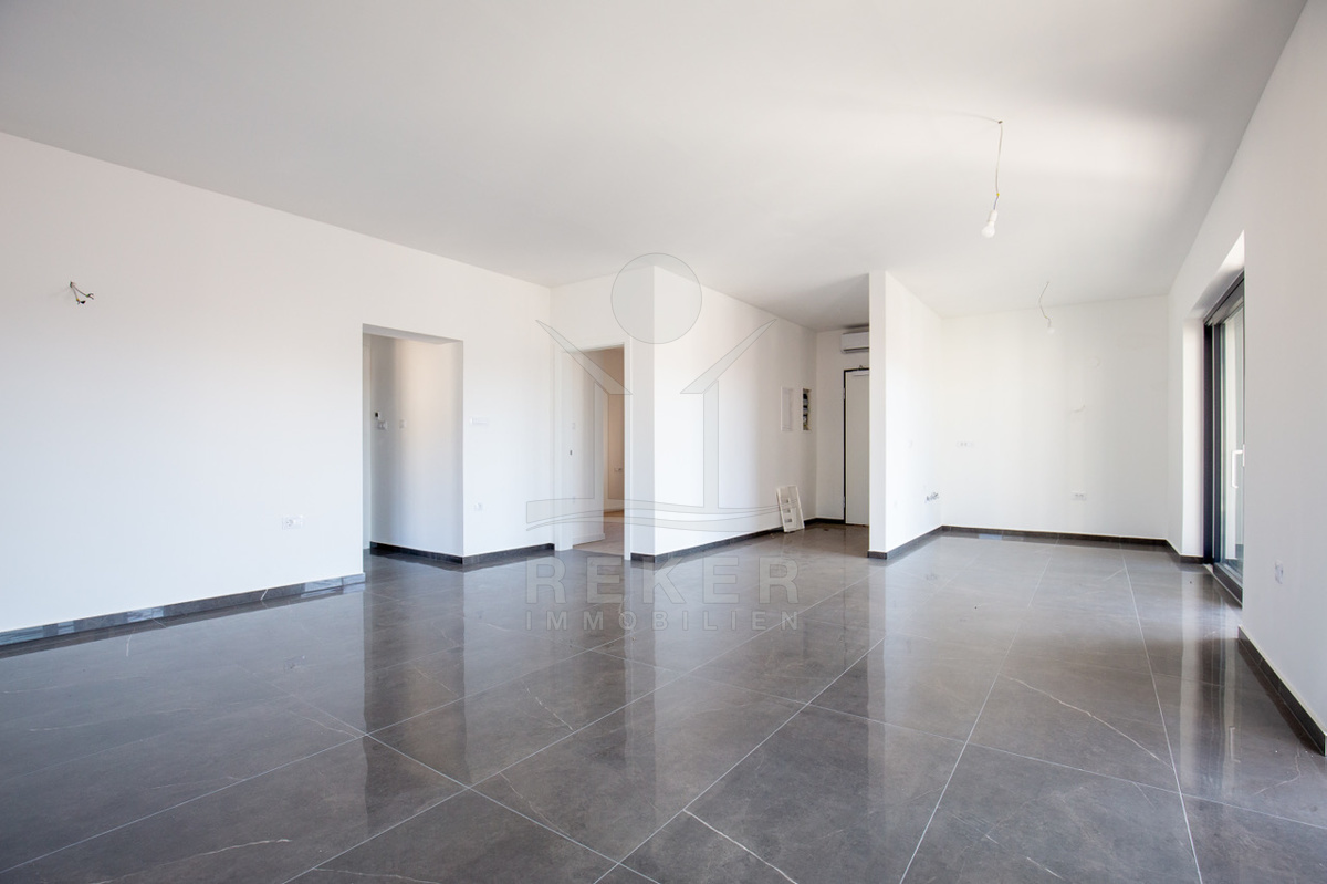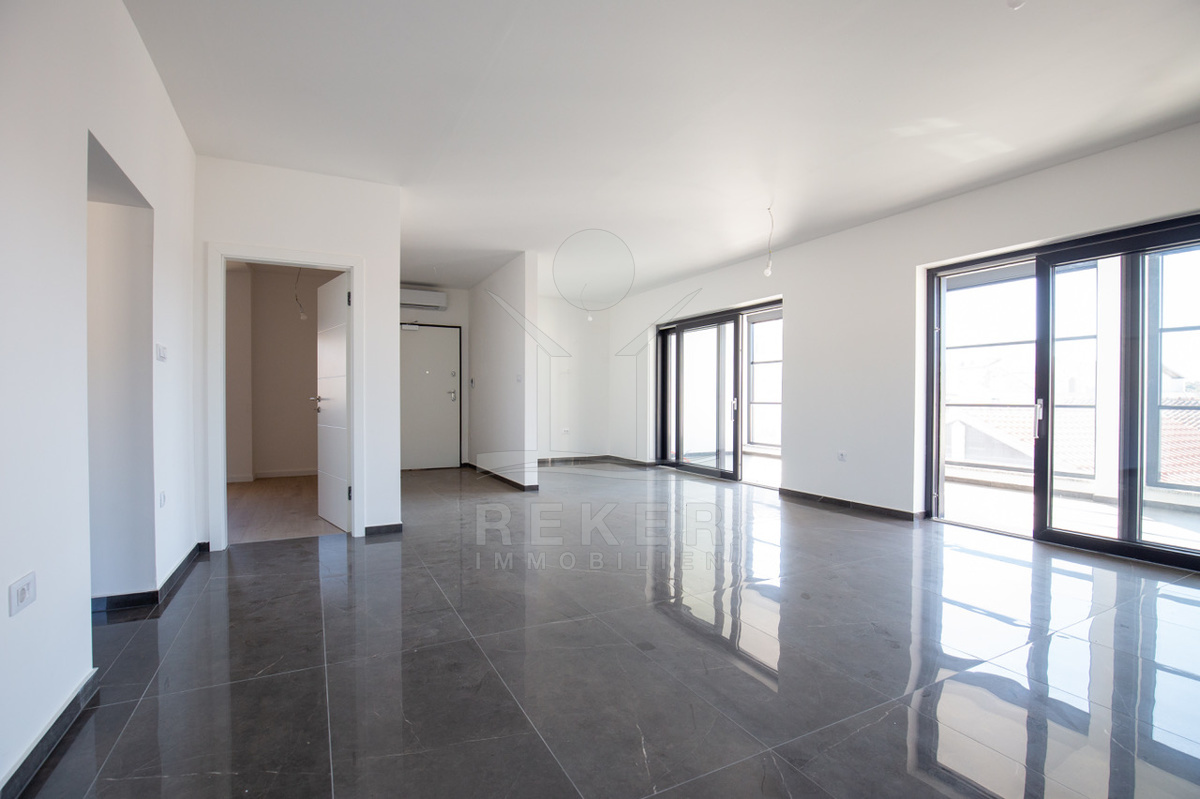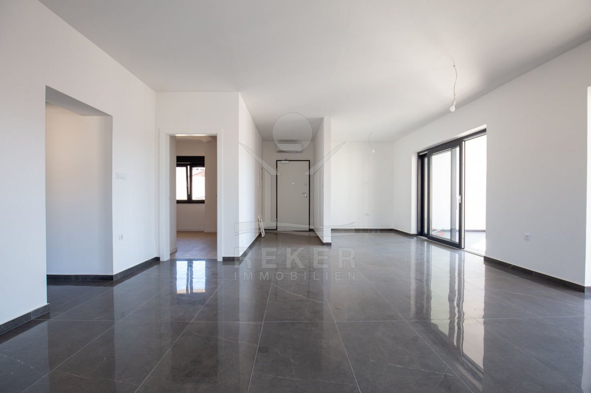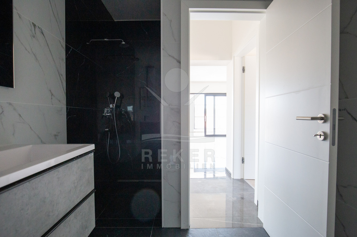 Die schöne Erdgeschosswohnung bietet eine Wohnfläche von 123 m², die durch einen offenen Grundriss besticht. Der lichtdurchflutete Wohn-, Ess- und Küchenbereich schafft eine einladende Atmosphäre mit großräumige Terrasse für erholsame Stunden im Freien. Zwei Schlafzimmer, ein großer Raum für Wellness und ein stilvolles Badezimmer sorgen für zusätzlichen Komfort. Die Klimaanlage sorgt an heißen Tagen für eine angenehme Raumtemperatur.