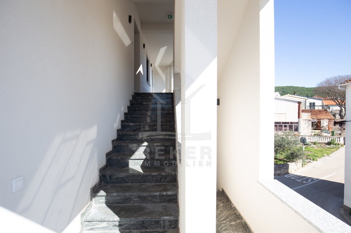 Die Neubauwohnung befindet sich in Tribunj, nur 50 Meter vom glitzernden Meer entfernt und in der begehrten 2. Reihe. Der malerische Küstenort Tribunj, westlich von Vodice, vereint charmante Tradition mit moderner Lebensqualität. Hier genießen Sie die Ruhe und den Charme des dalmatinischen Lebensstils, während Sie gleichzeitig die Nähe zu den lebhaften Angeboten von Vodice haben.