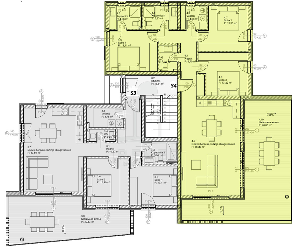 Die Etagenwohnung bietet einen großzügigen offenen Grundriss von 133 m², der ideal für modernes Wohnen ist. Der Eingangsbereich führt in einen hellen Wohn-, Ess- und Küchenbereich, der perfekt für gesellige Abende geeignet ist. Eine überdachte Terrasse von 46 m² erweitert den Wohnraum. Mit 3 Schlafzimmern, von denen eines über ein eigenes Bad verfügt, finden Sie ausreichend Privatsphäre und Komfort. Insgesamt stehen Ihnen 2 Badezimmer, ein Gäste-WC und eine praktische Waschküche zur Verfügung.