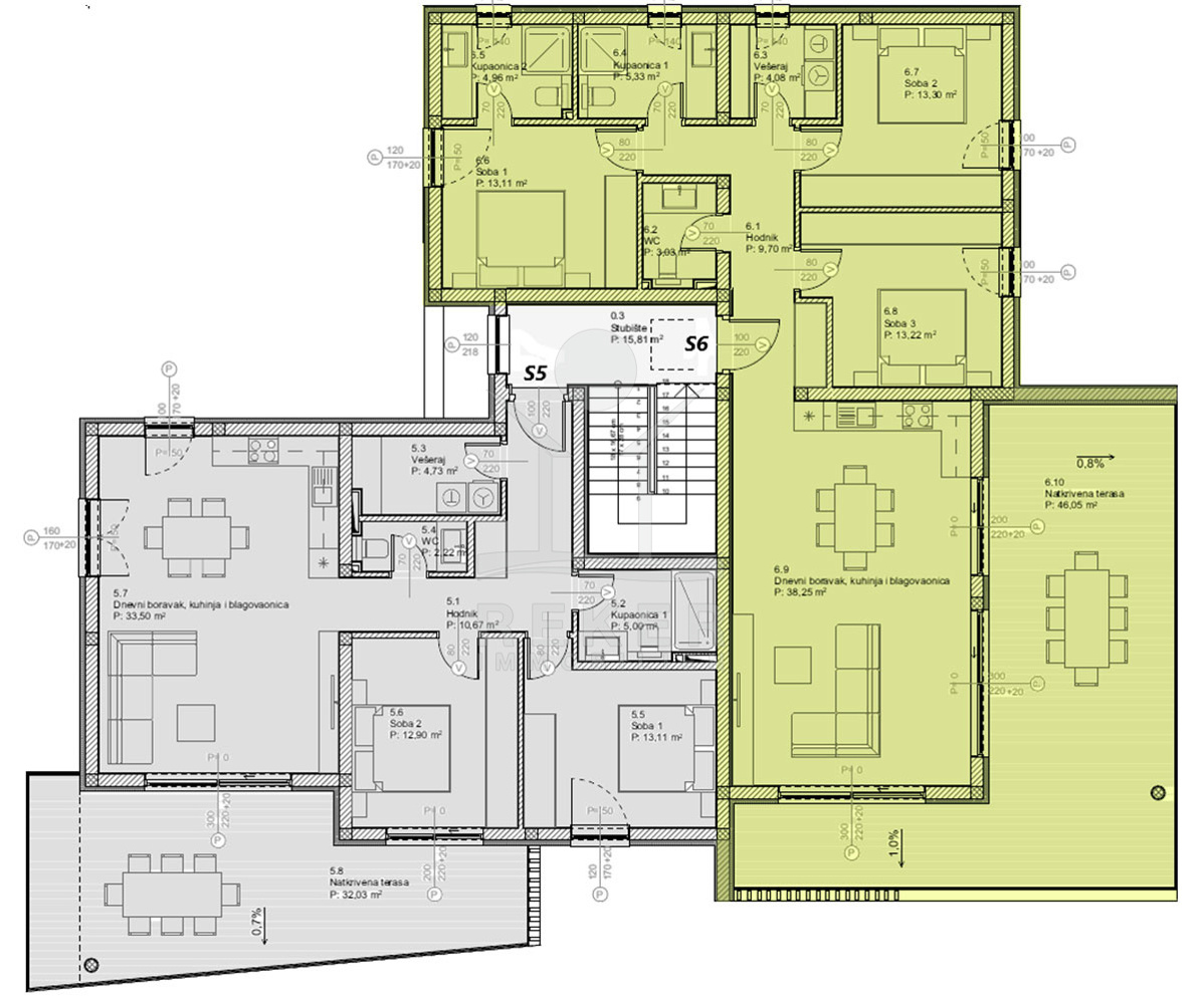 Die Etagenwohnung bietet einen großzügigen offenen Grundriss von 133 m², der ideal für modernes Wohnen ist. Der Eingangsbereich führt in einen hellen Wohn-, Ess- und Küchenbereich. Eine überdachte Terrasse mit Meerblick von 46 m² erweitert den Wohnraum. Mit 3 Schlafzimmern, von denen eines über ein eigenes Bad verfügt, finden Sie ausreichend Privatsphäre und Komfort. Insgesamt stehen Ihnen 2 Badezimmer, ein Gäste-WC und eine praktische Waschküche zur Verfügung.