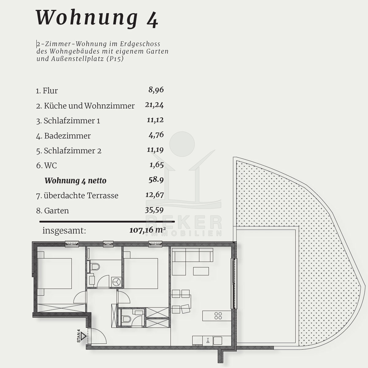 Die Erdgeschosswohnung besticht durch hochwertige Bauweise und luxuriöse Ausstattung. Auf 72 m² finden Sie stilvolles Wohnen mit Zugang zu einer großzügigen Gartenfläche von 36 m². Das Gebäude bietet Aufzüge, Klimaanlagen, Sicherheitskameras und moderne Sanitäranlagen. Fußbodenheizung (Installation in der gesamten Wohnung möglich gegen Aufpreis). Der Außenparkplatz bietet einen praktischen Stellplatz und zusätzliche Annehmlichkeiten wie Ladestationen für Elektrofahrzeuge.