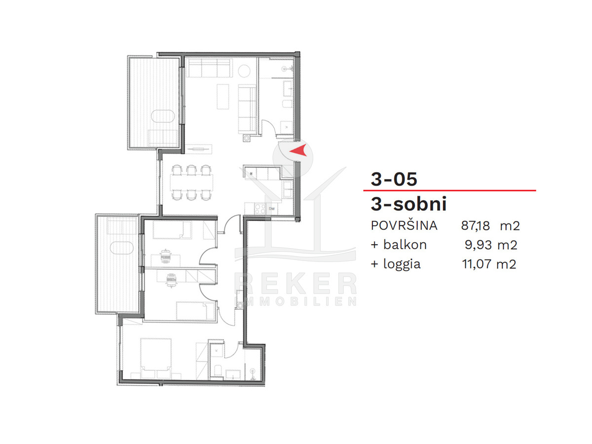 Der helle Wohn-, Ess- und Küchenbereich ist offen gestaltet und führt auf einen der beiden Balkone mit 11,07 m². Hier können Sie den Tag an der frischen Luft genießen, beim Frühstück, Lesen oder einfach beim Entspannen. Drei Schlafzimmer bieten Raum für Familie, Gäste oder Arbeit. Zwei Zimmer haben direkten Zugang zum zweiten Balkon mit 9,93 m², das Hauptschlafzimmer verfügt über ein eigenes Bad. Ein zweites Badezimmer ergänzt den Grundriss und erhöht den Komfort. Die Multisplit-Klimaanlage sorgt in allen Räumen für ein angenehmes Klima. Telefon-, TV- und Internetanschlüsse sowie eine Video-Gegensprechanlage sind vorhanden.