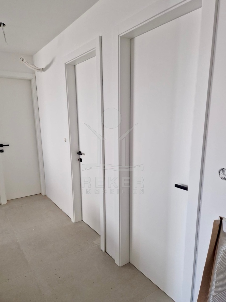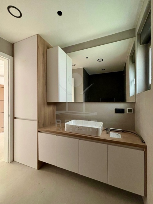 Der Innenraum dieser Wohnung im Obergeschoss greift die klare Linie des gesamten Projekts auf. Mittelpunkt ist der offene Wohnraum mit 33 m². Kochen, Essen und Wohnen sind hier zu einem großzügigen Bereich zusammengefasst. Von hier aus gelangen Sie direkt auf die überdachte Terrasse. Das Master-Schlafzimmer verfügt über ein eigenes Badezimmer. Ein weiteres Badezimmer ergänzt die Raumaufteilung sinnvoll. Ein separater Abstellraum unterstützt Ordnung im täglichen Ablauf. Die Wohnung wird unmöbliert übergeben.