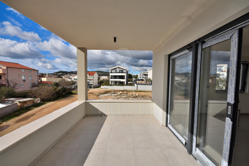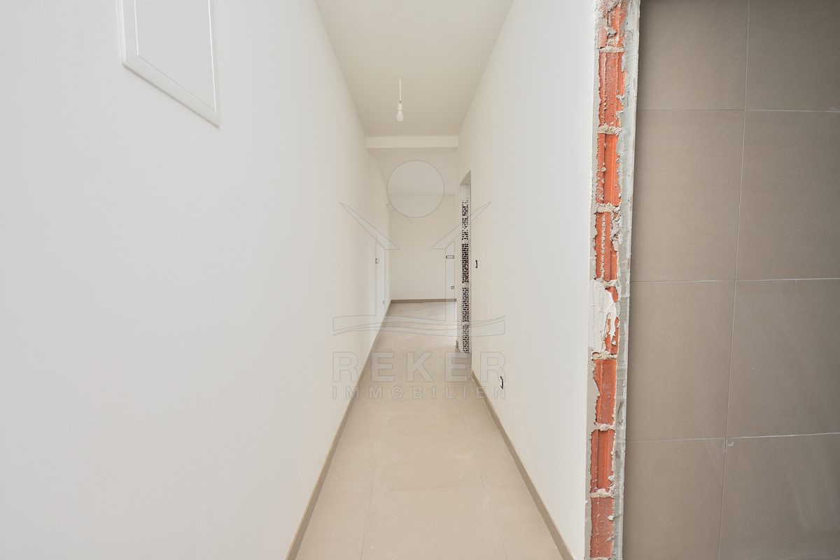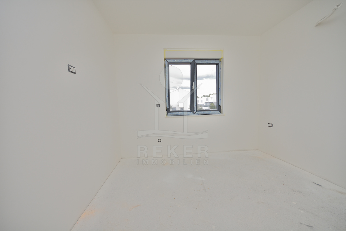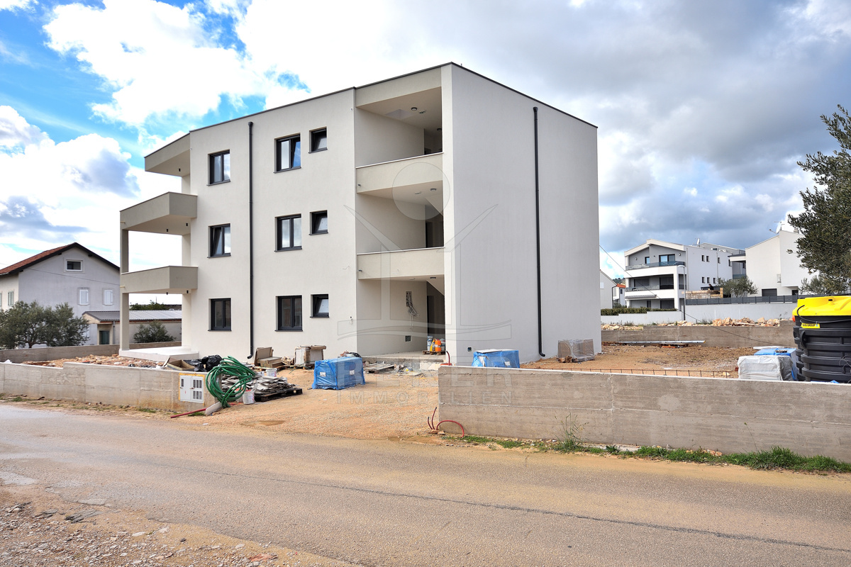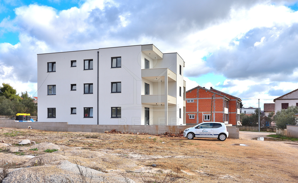 Vodice, ein ruhiges Wohnviertel, rund 700 Meter vom Zentrum entfernt. Auch zum Strand sind es nur wenige Gehminuten. Die Umgebung ist grün, locker bebaut und angenehm still. Das Gebäude wirkt modern, klar, aufgeräumt. Drei Etagen, sechs Wohnungen. Pro Stockwerk zwei Einheiten. Die Fertigstellung ist für Sommer 2026 geplant. Dann ziehen Sie schlüsselfertig ein. Vor dem Haus: zwei Parkplätze für die Wohnung.