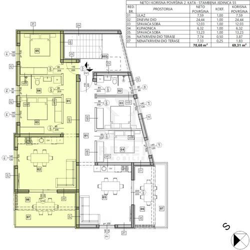 Die Wohnung S5 liegt im zweiten Stock. Zwei Schlafzimmer, ein Bad, ein großzügiger Wohn-Essbereich mit Zugang zum Balkon. Und der ist besonders: ein Teil überdacht, der andere offen – insgesamt über 15 m² mit Blick aufs Meer. Die Fensterfront Richtung Süden sorgt für viel Licht. Der Schnitt ist funktional, alles ist klar voneinander getrennt. Ideal für zwei, die nicht nur drinnen, sondern auch draußen wohnen möchten. Frühstück im Schatten, Sonne am Nachmittag, Ruhe am Abend – alles auf dem eigenen Balkon.