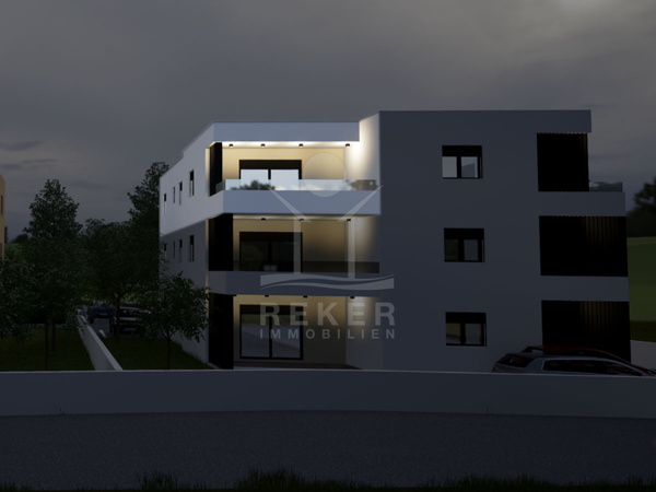 Vodice, ein ruhiges Wohnviertel, rund 700 Meter vom Zentrum entfernt. Auch zum Strand sind es nur wenige Gehminuten. Die Umgebung ist grün, locker bebaut und angenehm still. Das Gebäude wirkt modern, klar, aufgeräumt. Drei Etagen, sechs Wohnungen. Pro Stockwerk zwei Einheiten. Die Fertigstellung ist für Sommer 2026 geplant. Dann ziehen Sie schlüsselfertig ein. Vor dem Haus: ein Parkplatz pro Wohnung.