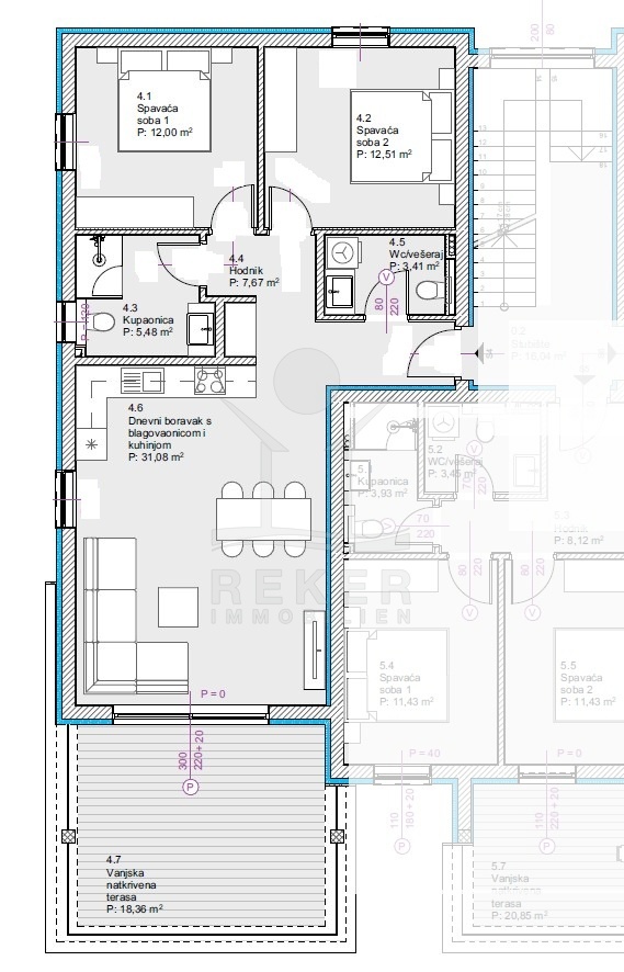 Das Herzstück dieser Wohnung ist der offene Wohn- und Essbereich mit 31,08 m². Küche, Essen und Wohnen verschmelzen zu einem großzügigen Raum voller Licht. Zwei Schlafzimmer mit 12,00 m² und 12,51 m² bieten Platz zum Ausruhen. Ergänzt wird der Grundriss durch ein Badezimmer mit 5,48 m² sowie ein Gäste-WC, das zugleich als Waschküche dient. Ein Highlight ist die 18,36 m² große Loggia. Überdacht und im ersten Stock gelegen, gehört sie zu den geschützten Außenflächen. Der freie Blick auf das Meer macht sie zu einem besonderen Ort. Zur Wohnung gehört auch ein eigener Parkplatz direkt vor dem Gebäude. Kurze Wege, mehr Komfort im Alltag.