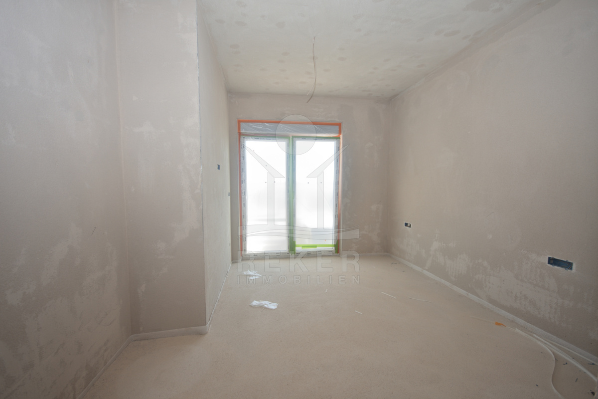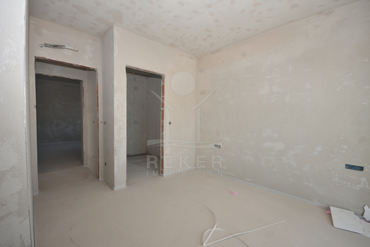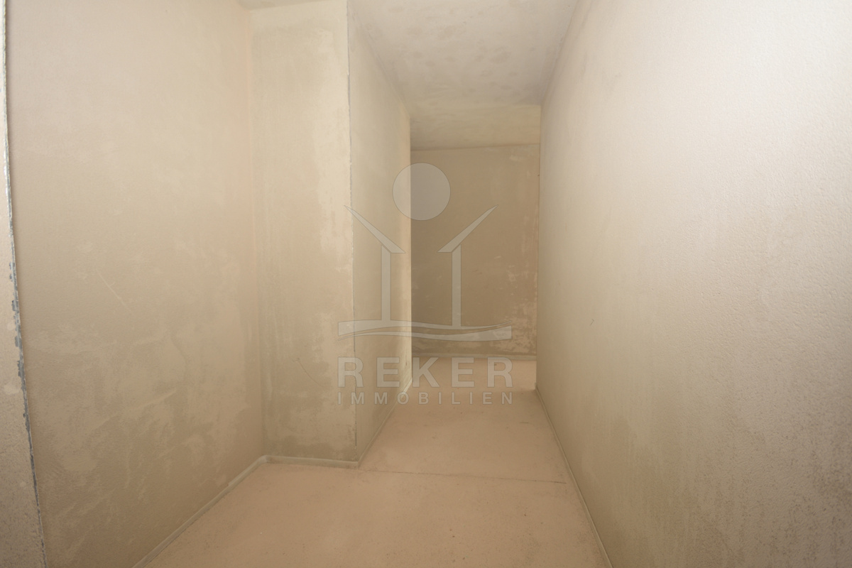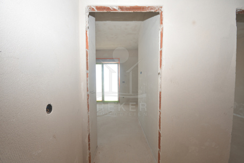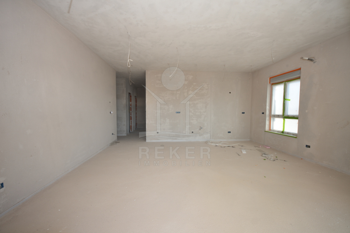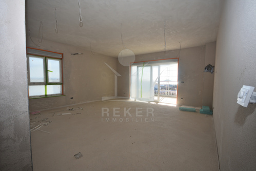Im zweiten Obergeschoss erwartet Sie eine Wohnung mit 93,40 m² Wohnfläche. Der Grundriss umfasst drei Schlafzimmer, zwei Badezimmer und einen offenen Wohn- und Essbereich mit Küche. Ein Schlafzimmer verfügt über ein eigenes Bad, ergänzt durch ein weiteres Badezimmer. Hinzu kommt ein Gäste-WC mit integrierter Waschküche. Zwei Loggien mit zusammen 29,84 m² sind ein echtes Plus. Überdacht und geschützt, öffnen sie den Blick auf das Meer. Zur Wohnung gehören außerdem zwei Stellplätze direkt am Gebäude. Kurze Wege, mehr Komfort.