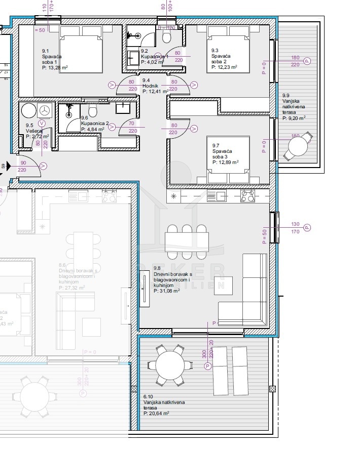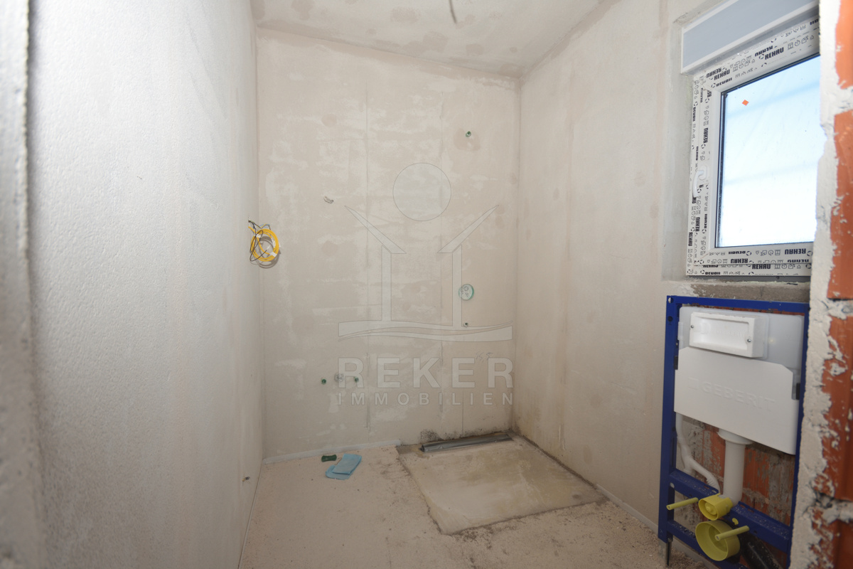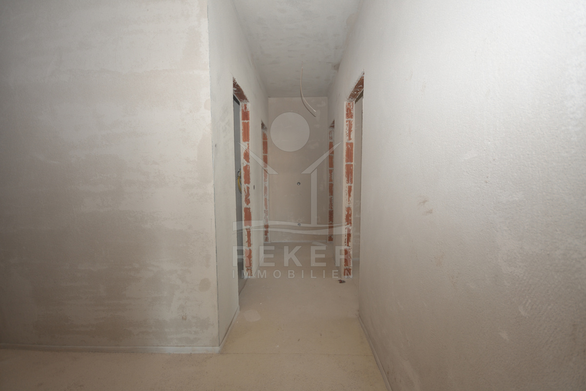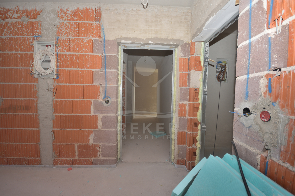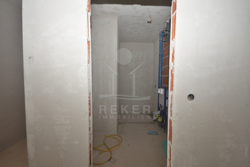 Im zweiten Obergeschoss erwartet Sie eine Wohnung mit 93,40 m² Wohnfläche. Der Grundriss umfasst drei Schlafzimmer, zwei Badezimmer und einen offenen Wohn- und Essbereich mit Küche. Ein Schlafzimmer verfügt über ein eigenes Bad, ergänzt durch ein weiteres Badezimmer. Hinzu kommt ein Gäste-WC mit integrierter Waschküche. Zwei Loggien mit zusammen 29,84 m² sind ein echtes Plus. Überdacht und geschützt, öffnen sie den Blick auf das Meer. Zur Wohnung gehören außerdem zwei Stellplätze direkt am Gebäude. Kurze Wege, mehr Komfort.