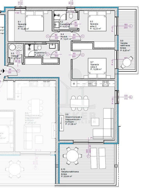 m zweiten Obergeschoss erwartet Sie eine Wohnung mit 93,40 m² Wohnfläche. Der Grundriss umfasst drei Schlafzimmer, zwei Badezimmer und einen offenen Wohn- und Essbereich mit Küche. Ein Schlafzimmer verfügt über ein eigenes Bad, ergänzt durch ein weiteres Badezimmer. Hinzu kommt ein Gäste-WC mit integrierter Waschküche. Zwei Loggien mit zusammen 29,84 m² sind ein echtes Plus. Überdacht und geschützt, öffnen sie den Blick auf das Meer. Zur Wohnung gehören außerdem zwei Stellplätze direkt am Gebäude. Kurze Wege, mehr Komfort.