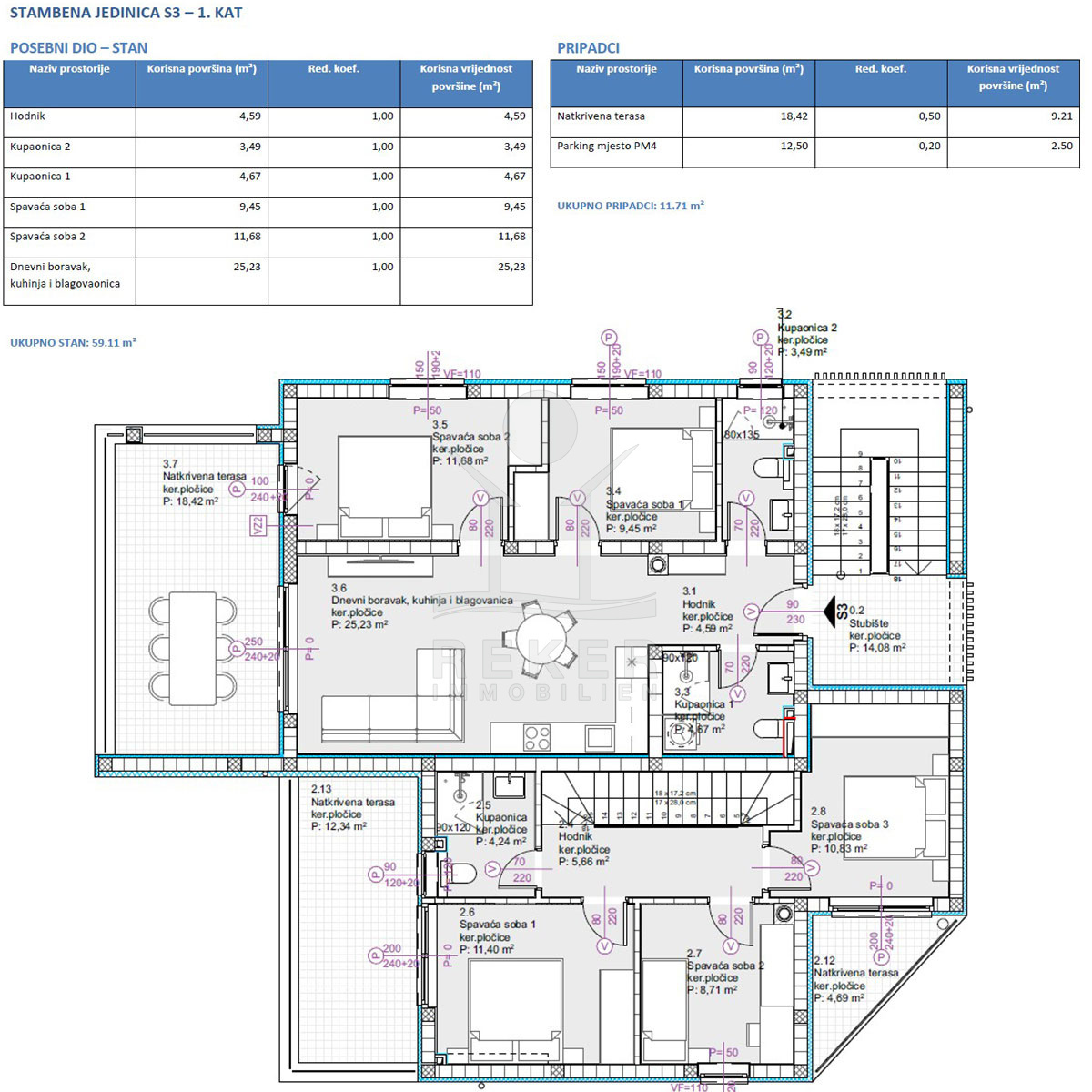 Die Wohnung S3 bietet 59 m² Innenfläche, klar aufgeteilt: ein Flur, zwei Schlafzimmer, zwei Badezimmer und ein großzügiger Wohn- und Essbereich mit Küche. Alles hell, modern und praktisch verbunden. Die Ausstattung ist hochwertig: PVC-Tischlerei, Klimaanlage in allen Räumen, Fußbodenheizung in den Bädern, Keramik in zeitgemäßer Optik. Südliche Ausrichtung sorgt für viel Licht und Wärme. Das Highlight ist der überdachte Balkon mit 18 m². Genug Platz für Tisch, Stühle oder Liegen – und der Blick geht weit über das Meer.