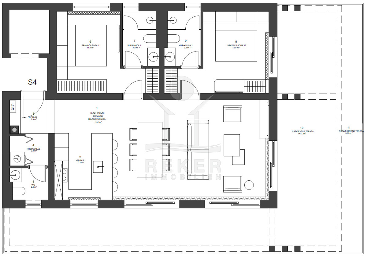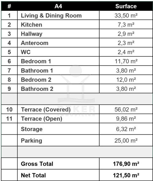 A4 bringt Raumgefühl und Rückzugsmöglichkeiten perfekt zusammen – und das alles auf nur einer Ebene. Das Herzstück ist der weitläufige Wohnbereich mit über 33 m², dazu eine offene Küche, ideal für gesellige Abende. Von hier geht’s direkt auf den riesigen Balkon – über 65 m² Fläche, zum Teil überdacht. Frühstück, Loungemöbel, Sonnenplatz? Hier passt alles nebeneinander.