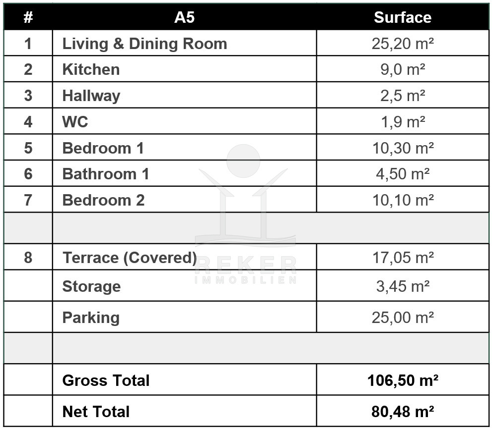 Ideal geschnitten, angenehm zurückgezogen und mit Ausblick. Der Wohnbereich öffnet sich direkt auf einen überdachten Balkon mit rund 17 m² – groß genug für einen Esstisch und zwei Liegestühle. Innen erwarten Sie zwei Schlafzimmer, ein Badezimmer und ein separates WC. Die Küche ist offen, aber mit klarem Bezug zum Essbereich. Auch hier gehören Fußbodenheizung, Klimaanlage, elektrische Rollläden und einbruchsichere Tür zur Ausstattung.