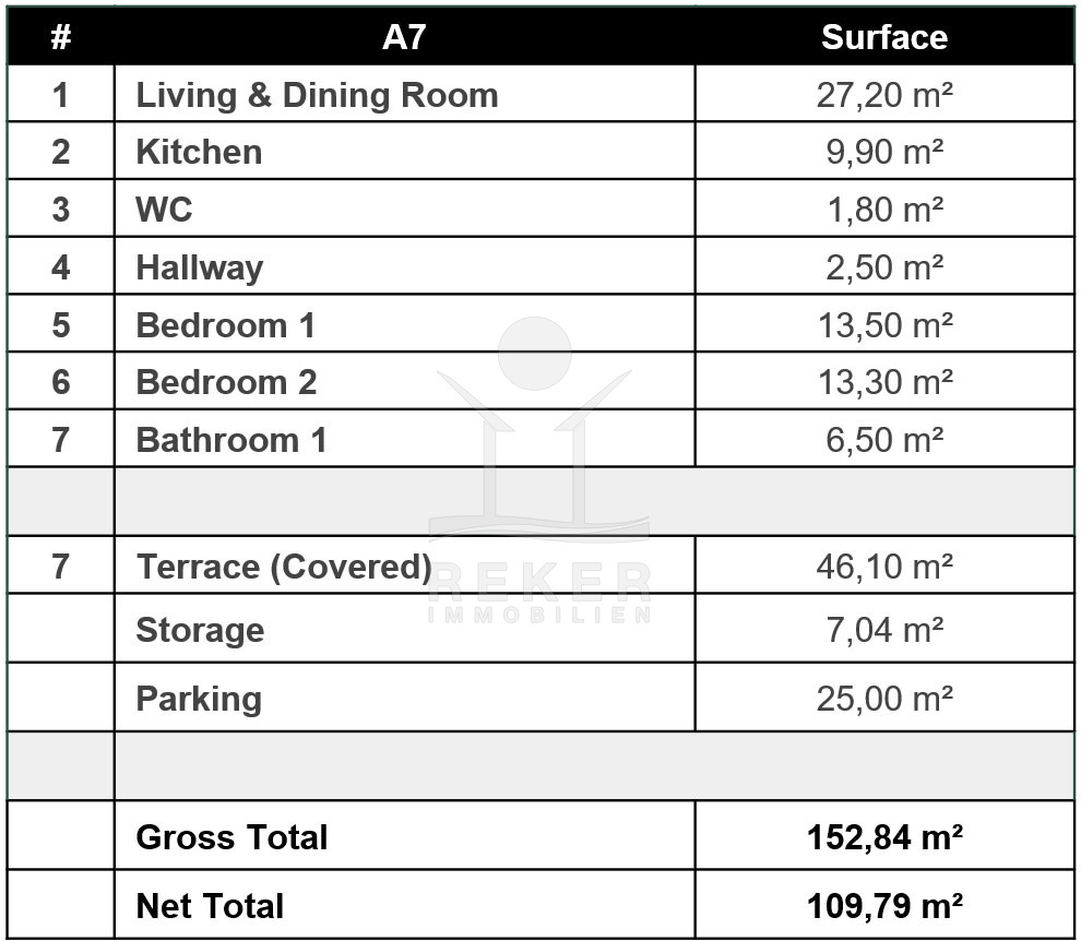 Drinnen wirkt alles großzügig. Fast 28 m² für Wohnen und Essen. Offene Küche mit Kochinsel. Viel Platz zum Kochen, Essen, Zusammensitzen. Dazu zwei richtig geräumige Schlafzimmer – beide mit mehr als 13 m². Das Bad mit fast 7 m² ist funktional und hell, dazu kommt ein separates WC. Viel Stauraum im Flur. Alles auf einer Ebene, kurze Wege, klar strukturiert.