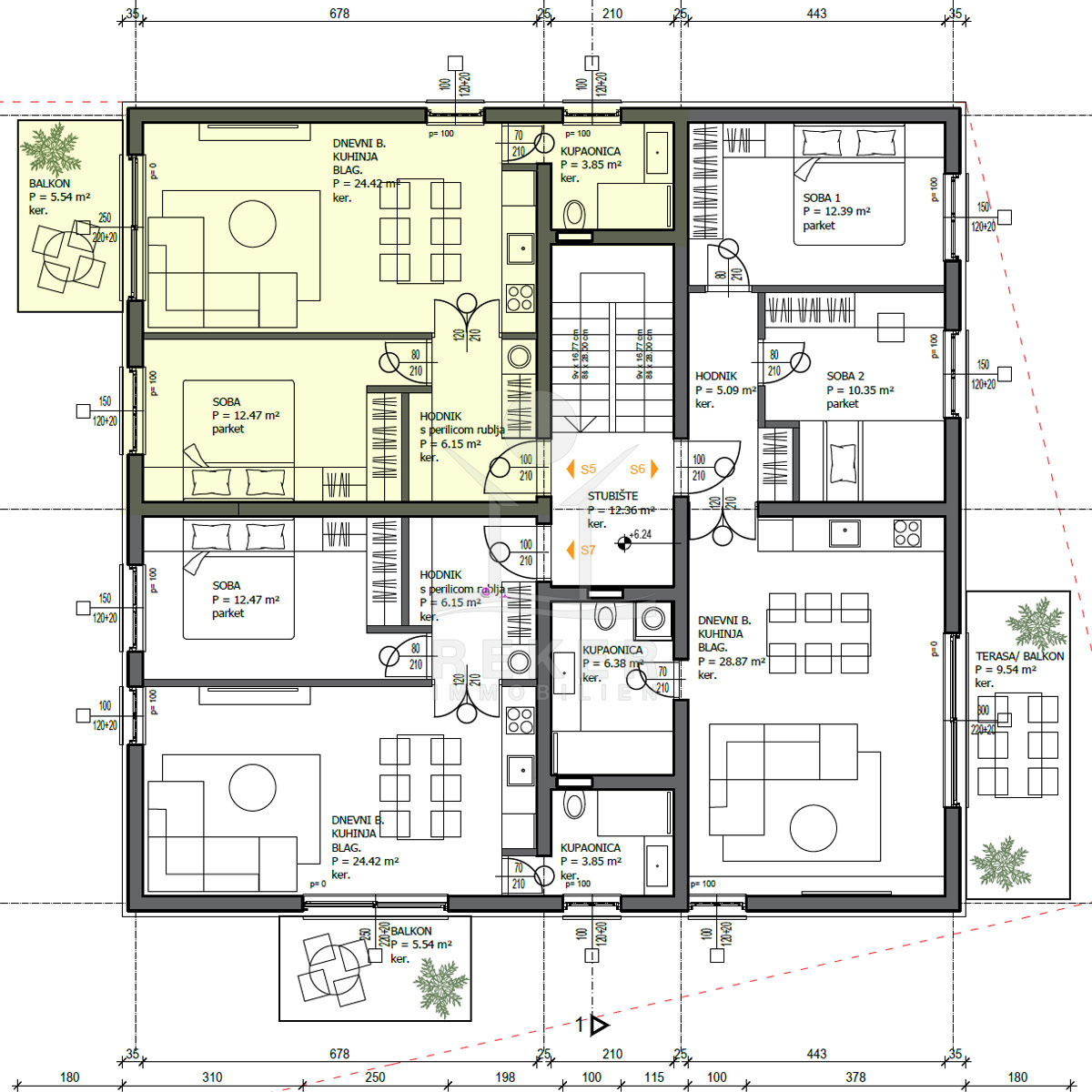 Ein Balkon mit Westblick – das heißt: Licht bis zum Abend und Sonnenuntergänge inklusive. Die Wohnung S5 liegt im zweiten Stock, schön ruhig, mit viel Helligkeit und Weitblick. Auf knapp 47 m² finden Sie einen offenen Wohn-/Essbereich, ein gut geschnittenes Schlafzimmer, ein modernes Bad und durchdachte Details. Im Wohnzimmer liegt Parkett, die Küche ist direkt integriert, alles wirkt offen und klar. Das Bad ist mit elektrischer Fußbodenheizung ausgestattet – angenehm, nicht nur im Winter. Die Klimaanlage kühlt jeden Raum einzeln. Fenster mit Dreifachverglasung, Moskitonetzen und elektrischen Jalousien sorgen für Komfort und Ruhe.