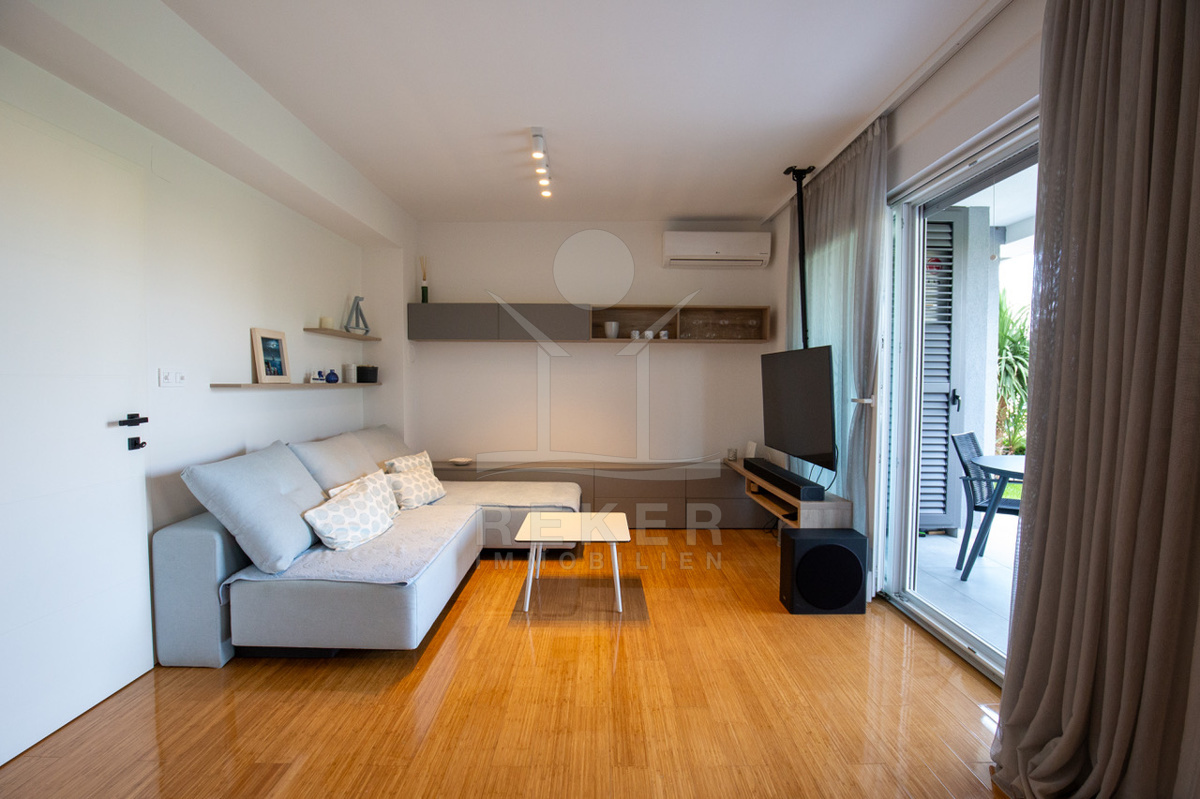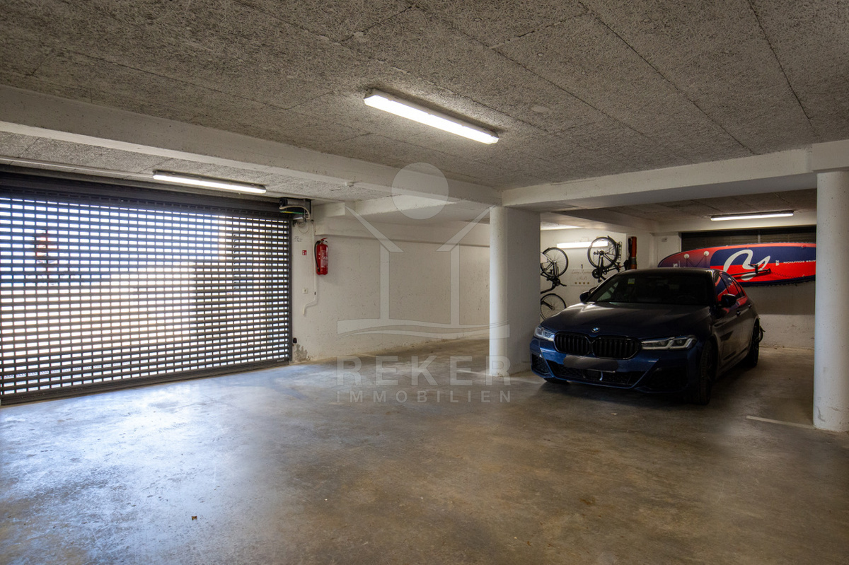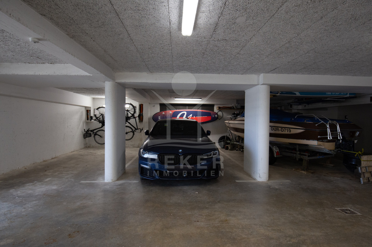 Die überdachte Terrasse mit direktem Blick aufs Wasser wird schnell zum Lieblingsplatz. Morgens mit Kaffee, abends mit einem Glas Wein. Nur ein paar Schritte weiter: der eigene mediterrane Garten mit Palmen, Blüten und Außendusche. Alles wirkt privat, ruhig und entspannt – ganz ohne großen Pflegeaufwand. Zwei Stellplätze in der Tiefgarage runden das Gesamtbild ab. Gerade an heißen Sommertagen ein echter Vorteil.